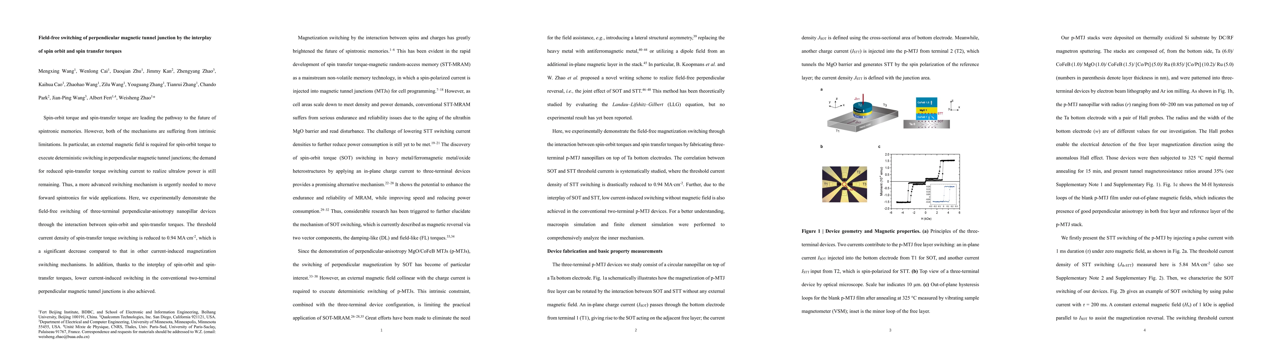 This paper demonstrates field-free switching in perpendicular magnetic tunnel junctions via the interplay of spin-orbit torque and spin-transfer torque, significantly reducing the threshold current density to 0.94 MA/cm², thus advancing low-power spintronic memory applications.