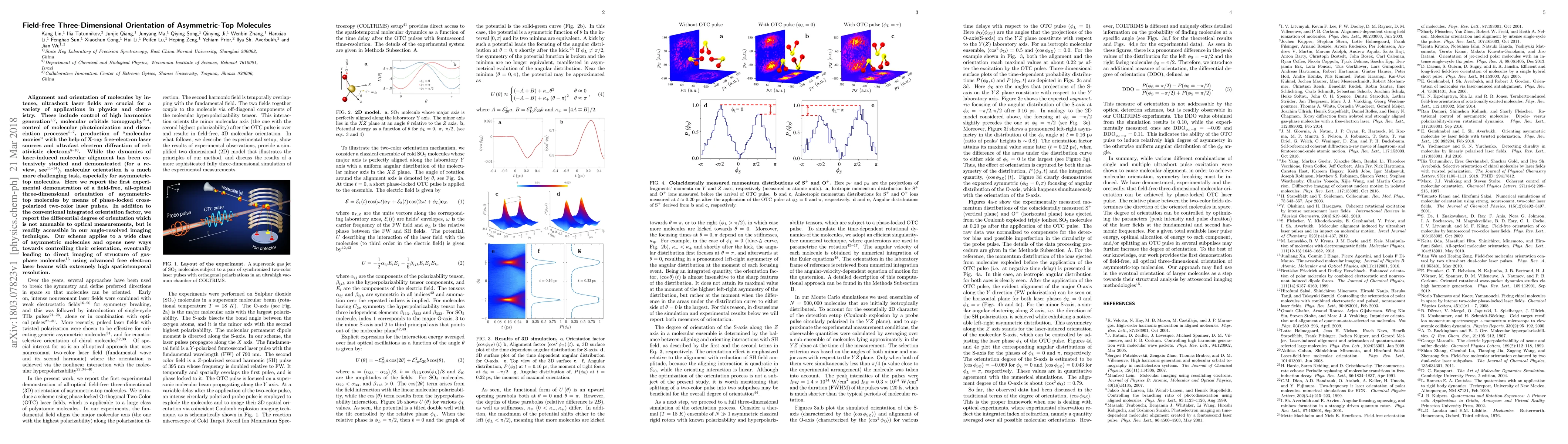 This paper reports the first experimental demonstration of a field-free, all-optical three-dimensional orientation of asymmetric-top molecules using phase-locked cross-polarized two-color laser pulses, enabling new control methods for molecular dynamics and advanced imaging techniques.