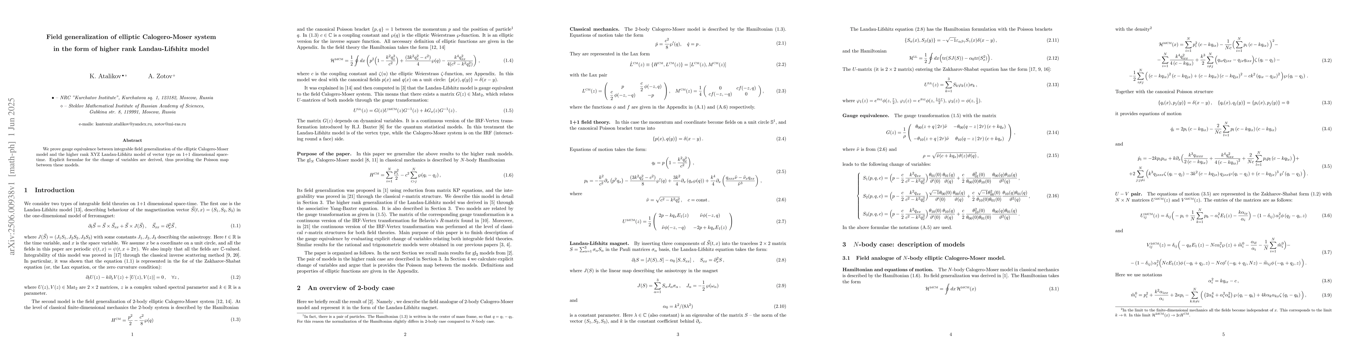 The research proves gauge equivalence between an integrable field generalization of the elliptic Calogero-Moser model and the higher rank XYZ Landau-Lifshitz model of vector type on 1+1 dimensional space-time, deriving explicit formulae for the change of variables and providing a Poisson map between these models.