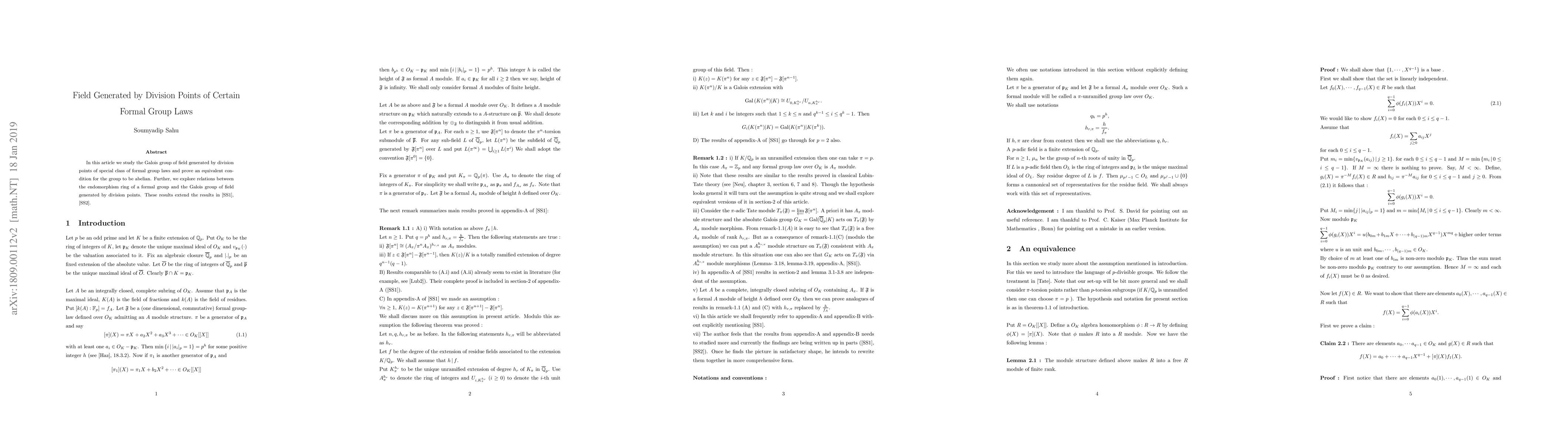 Summary: This paper investigates the Galois group of fields generated by division points of specific formal group laws, proving conditions for the group's abelian nature and examines connections between the endomorphism ring of the formal group and the Galois group.
