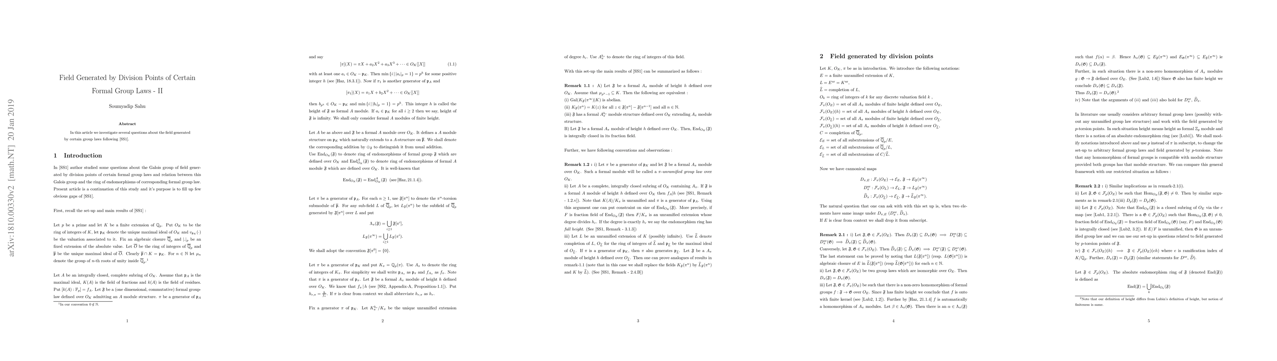 The article investigates several questions about field generated by certain formal group laws. This is continuation of a study initiated by the author in prior article titled 'Field Generated by Division Points of Certain Formal Group Laws'.