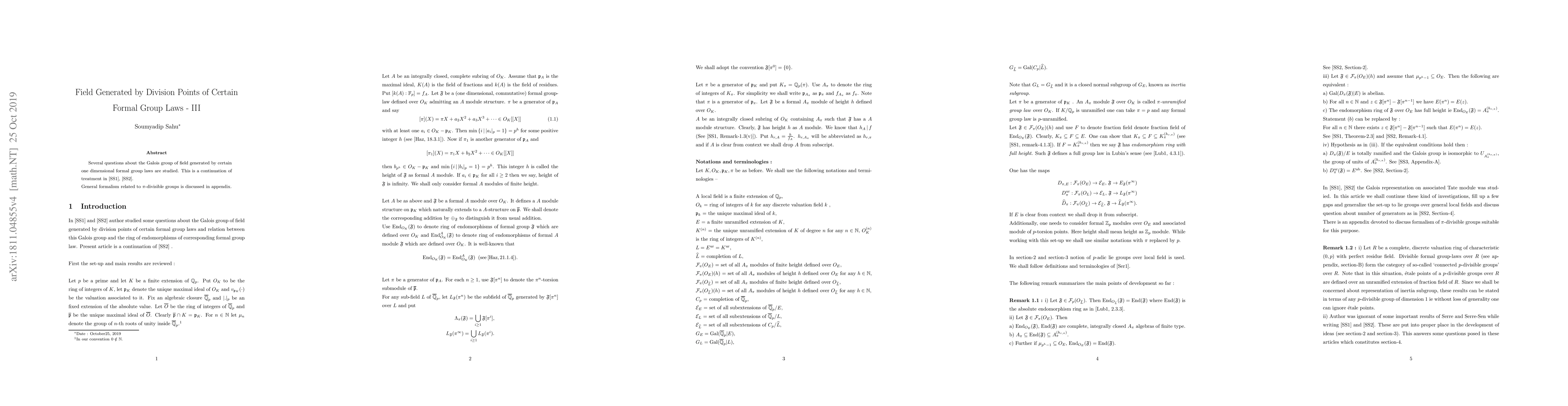 Several questions about the Galois group of field generated by certain one dimensional formal group laws are studied. This is continuation of author's prior article titled 'Field Generated by Division Points of Certain Formal Group Laws - II'. General formalism related to $\pi$-divisible groups is discussed in appendix.