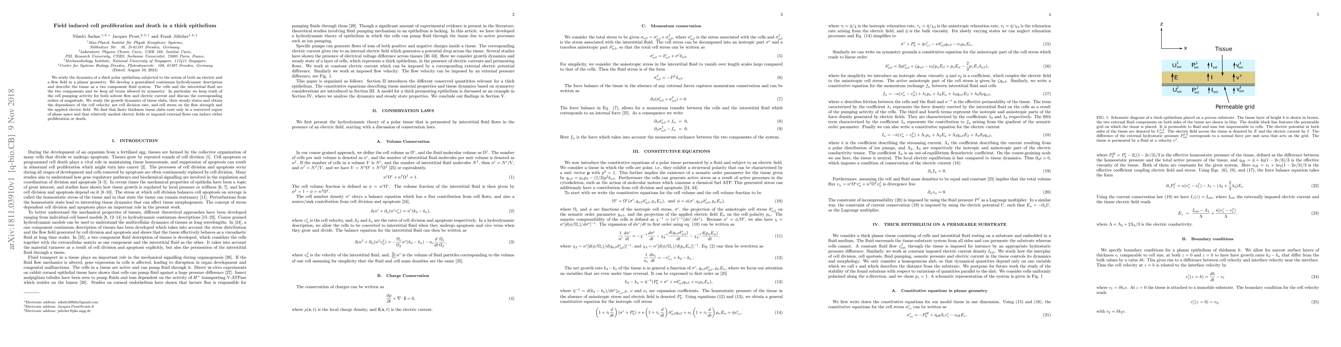 We study the dynamics of a thick polar epithelium subjected to the action of both an electric and a flow field in a planar geometry. We develop a generalized continuum hydrodynamic description and describe the tissue as a two component fluid system. The cells and the interstitial fluid are the two components and we keep all terms allowed by symmetry. In particular we keep track of the cell pumping activity for both solvent flow and electric current and discuss the corresponding orders of magnitude. We study the growth dynamics of tissue slabs, their steady states and obtain the dependence of the cell velocity, net cell division rate, and cell stress on the flow strength and the applied electric field. We find that finite thickness tissue slabs exist only in a restricted region of phase space and that relatively modest electric fields or imposed external flows can induce either proliferation or death.