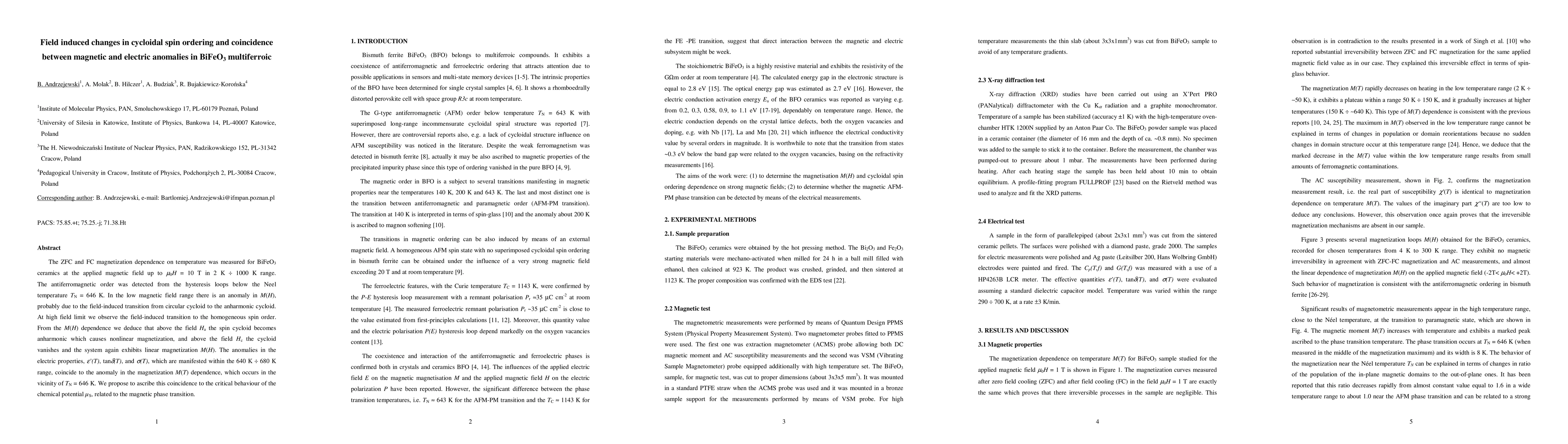 The ZFC and FC magnetization dependence on temperature was measured for BiFeO3 ceramics at the applied magnetic field up to H=10T in 2K-1000K range. The antiferromagnetic order was detected from the hysteresis loops below the Neel temperature TN=646K. In the low magnetic field range there is an anomaly in M(H), probably due to the field-induced transition from circular cycloid to the anharmonic cycloid. At high field limit we observe the field-induced transition to the homogeneous spin order. From the M(H) dependence we deduce that above the field Ha the spin cycloid becomes anharmonic which causes nonlinear magnetization, and above the field Hc the cycloid vanishes and the system again exhibits linear magnetization M(H). The anomalies in the electric properties, which are manifested within the 640K-680K range, coincide to the anomaly in the magnetization M(T) dependence, which occurs in the vicinity of TN. We propose to ascribe this coincidence to the critical behaviour of the chemical potential, related to the magnetic phase transition.