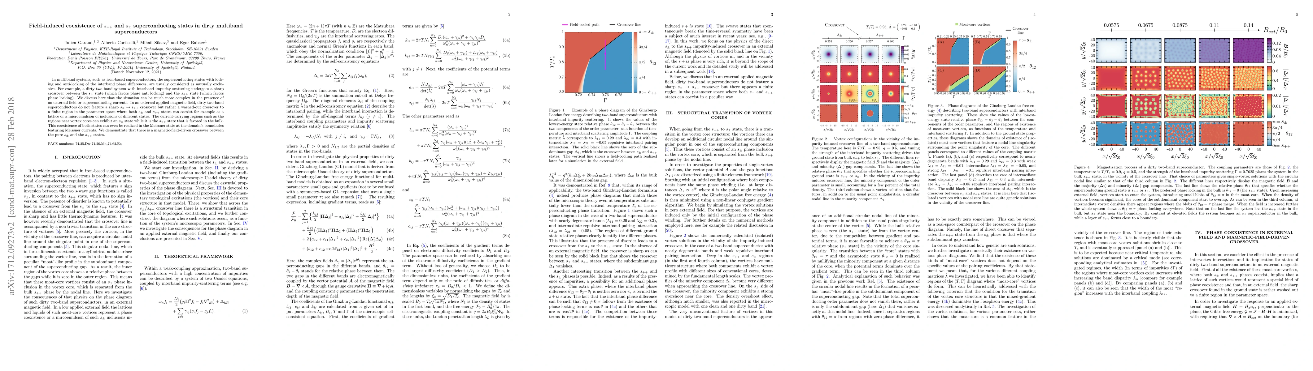 In multiband systems, such as iron-based superconductors, the superconducting states with locking and anti-locking of the interband phase differences, are usually considered as mutually exclusive. For example, a dirty two-band system with interband impurity scattering undergoes a sharp crossover between the $s_{\pm}$ state (which favors phase anti locking) and the $s_{++}$ state (which favors phase locking). We discuss here that the situation can be much more complex in the presence of an external field or superconducting currents. In an external applied magnetic field, dirty two-band superconductors do not feature a sharp $s_{\pm}\to s_{++}$ crossover but rather a washed-out crossover to a finite region in the parameter space where both $s_{\pm}$ and $s_{++}$ states can coexist for example as a lattice or a microemulsion of inclusions of different states. The current-carrying regions such as the regions near vortex cores can exhibit an $s_\pm$ state while it is the $s_{++}$ state that is favored in the bulk. This coexistence of both states can even be realized in the Meissner state at the domain's boundaries featuring Meissner currents. We demonstrate that there is a magnetic-field-driven crossover between the pure $s_{\pm}$ and the $s_{++}$ states.
