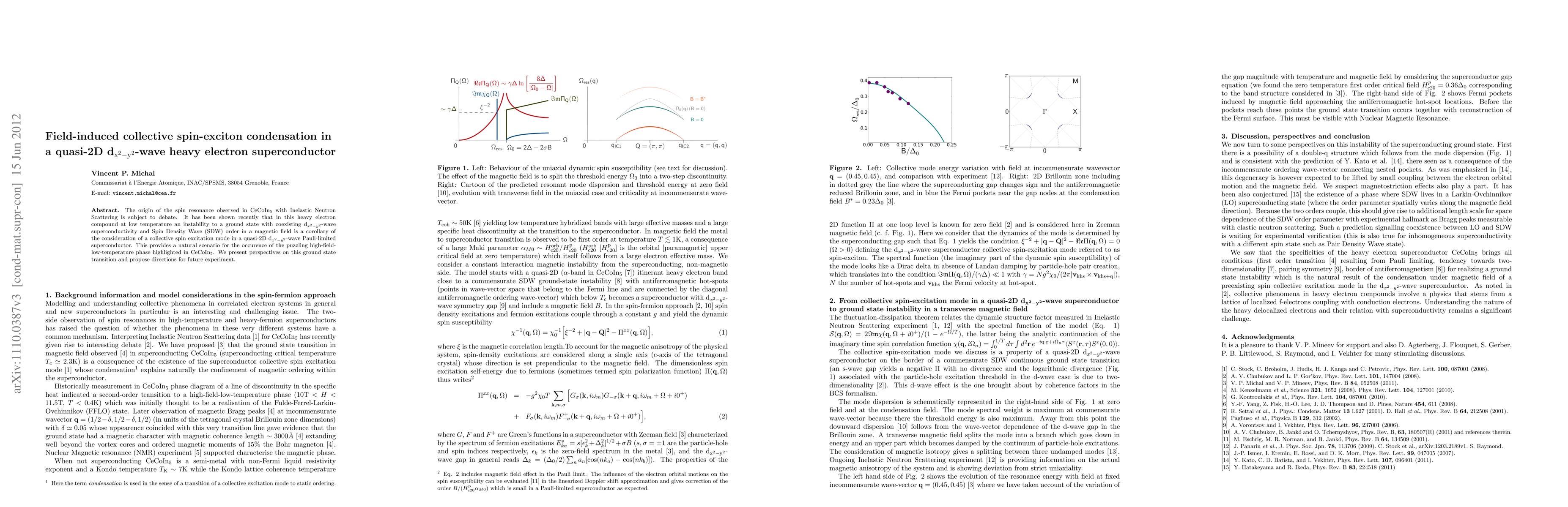 The origin of the spin resonance observed in CeCoIn5 with Inelastic Neutron Scattering is subject to debate. It has been shown recently that in this heavy electron compound at low temperature an instability to a ground state with coexisting dx2 -y2 -wave superconductivity and Spin Density Wave (SDW) order in a magnetic field is a corollary of the consideration of a collective spin excitation mode in a quasi-2D dx2 -y2 -wave Pauli-limited superconductor. This provides a natural scenario for the occurence of the puzzling high-field-low-temperature phase highlighted in CeCoIn5 . We present perspectives on this ground state transition and propose directions for future experiment.