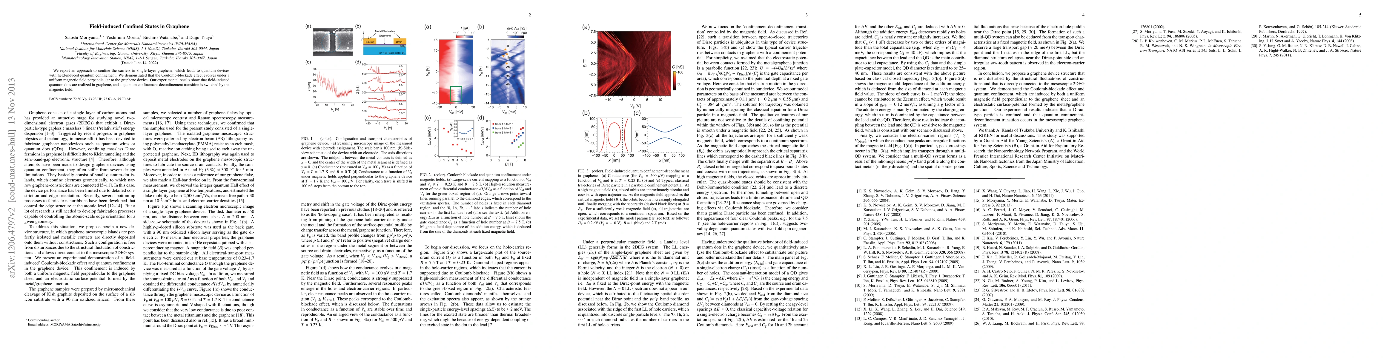 This paper presents a method to confine carriers in single-layer graphene, resulting in quantum devices with field-induced quantum confinement. The study demonstrates the Coulomb-blockade effect under a perpendicular magnetic field, showing the realization of field-induced quantum dots and a magnetic field-switchable quantum confinement-deconfinement transition.