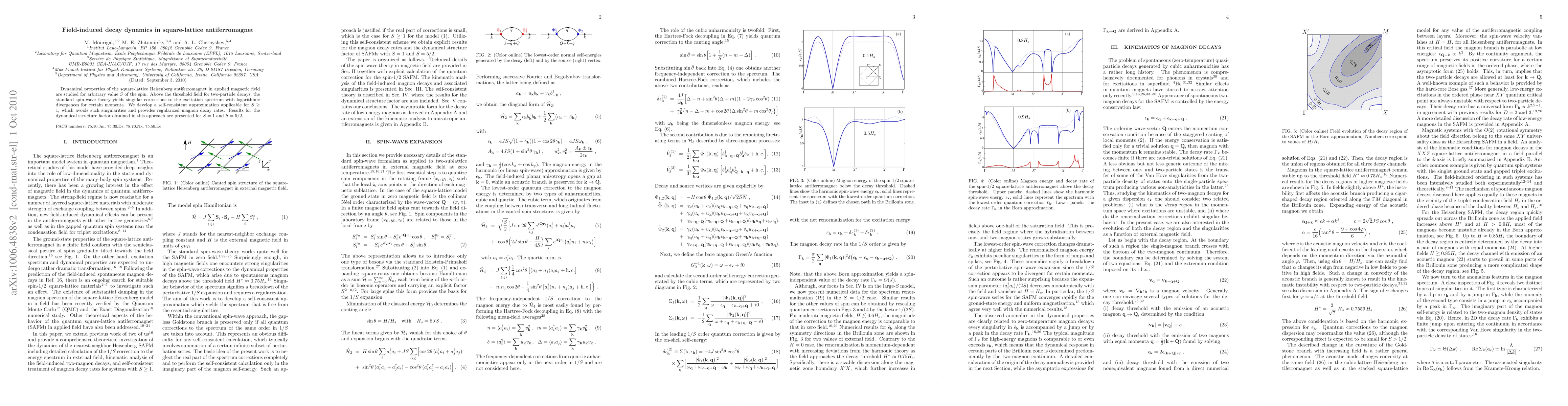 Dynamical properties of the square-lattice Heisenberg antiferromagnet in applied magnetic field are studied for arbitrary value S of the spin. Above the threshold field for two-particle decays, the standard spin-wave theory yields singular corrections to the excitation spectrum with logarithmic divergences for certain momenta. We develop a self-consistent approximation applicable for S >= 1, which avoids such singularities and provides regularized magnon decay rates. Results for the dynamical structure factor obtained in this approach are presented for S = 1 and S = 5/2.