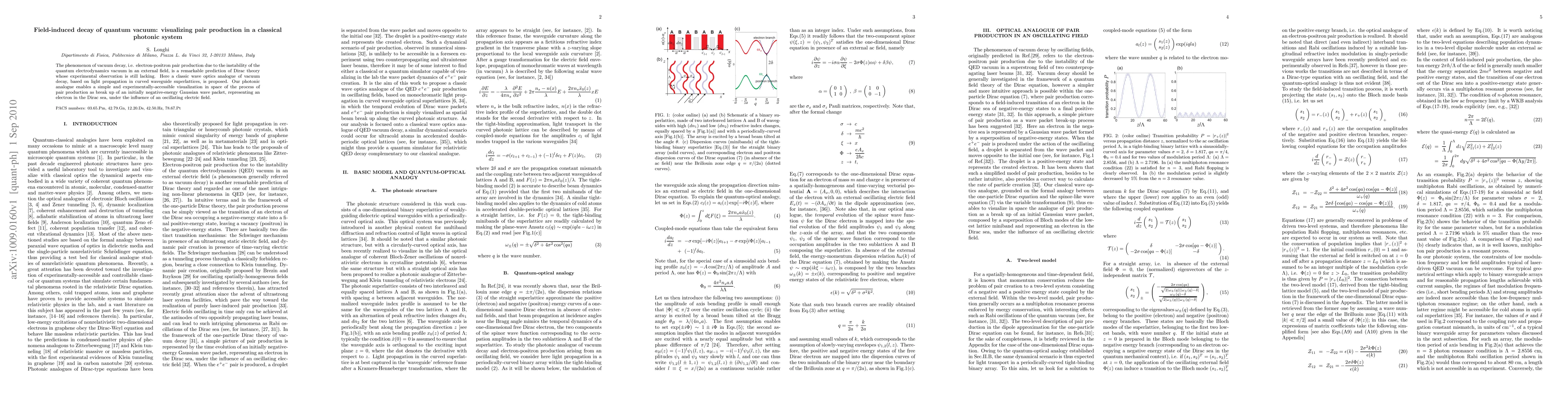 The phenomenon of vacuum decay, i.e. electron-positron pair production due to the instability of the quantum electrodynamics vacuum in an external field, is a remarkable prediction of Dirac theory whose experimental observation is still lacking. Here a classic wave optics analogue of vacuum decay, based on light propagation in curved waveguide superlattices, is proposed. Our photonic analogue enables a simple and experimentally-accessible visualization in space of the process of pair production as break up of an initially negative-energy Gaussian wave packet, representing an electron in the Dirac sea, under the influence of an oscillating electric field.