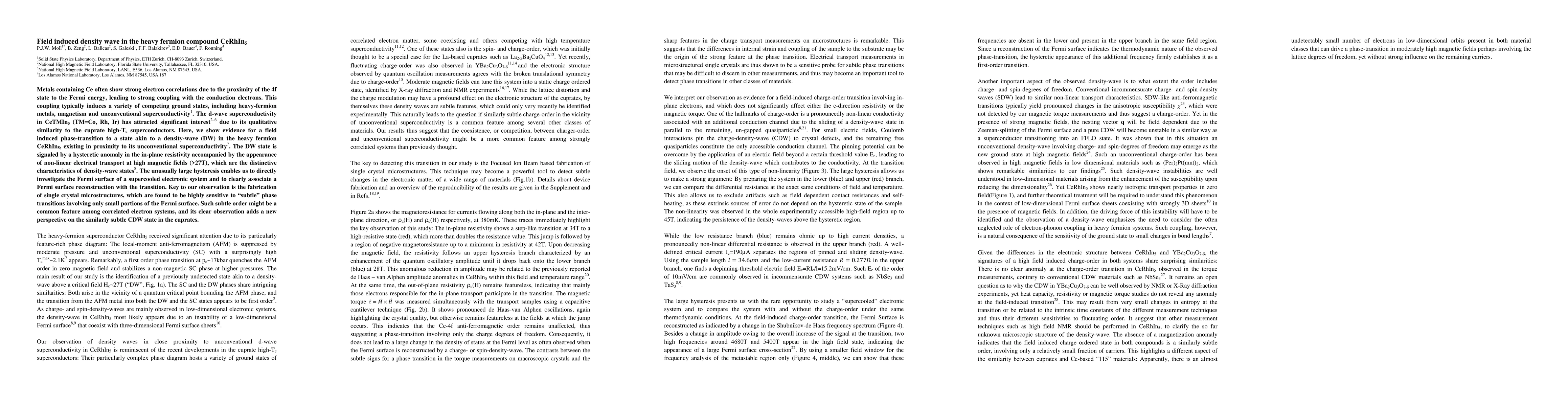 This paper reports a field-induced phase transition to a density-wave state in the heavy fermion compound CeRhIn5, characterized by hysteretic anomalies in resistivity and non-linear electrical transport at high magnetic fields. The study highlights the sensitivity of single crystal microstructures to subtle Fermi surface reconstructions, suggesting a commonality among correlated electron systems.