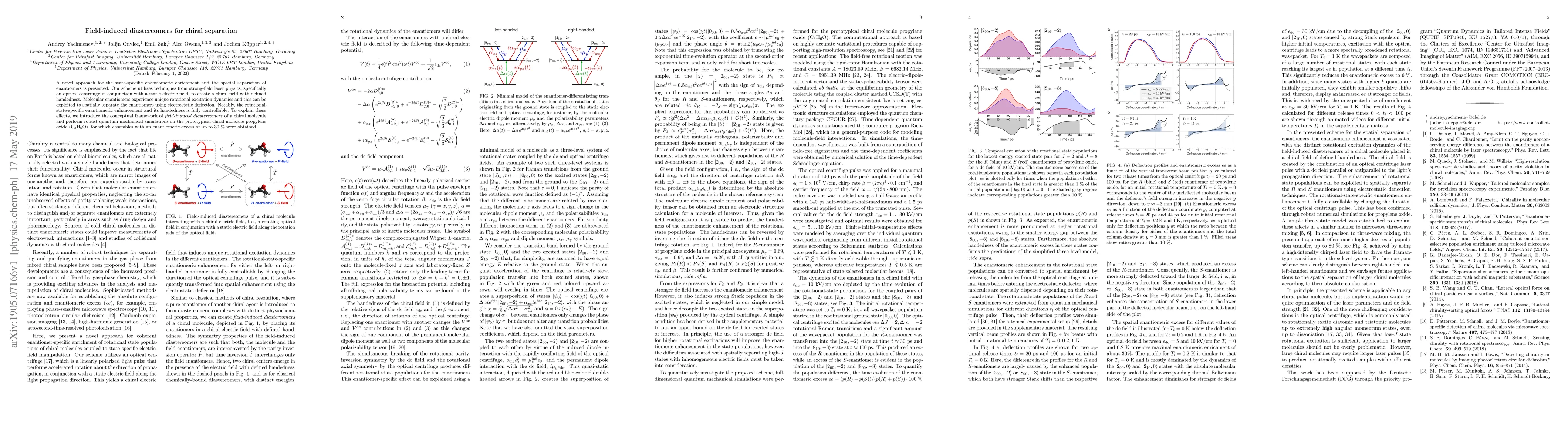 A novel approach for the state-specific enantiomeric enrichment and the spatial separation of enantiomers is presented. Our scheme utilizes techniques from strong-field laser physics, specifically an optical centrifuge in conjunction with a static electric field, to create a chiral field with defined handedness. Molecular enantiomers experience unique rotational excitation dynamics and this can be exploited to spatially separate the enantiomers using electrostatic deflection. Notably, the rotational-state-specific enantiomeric enhancement and its handedness is fully controllable. To explain these effects, we introduce the conceptual framework of $field\text{-}induced~diastereomers$ of a chiral molecule and perform robust quantum mechanical simulations on the prototypical chiral molecule propylene oxide (C$_3$H$_6$O), for which ensembles with an enantiomeric excess of up to $30~\%$ were obtained.