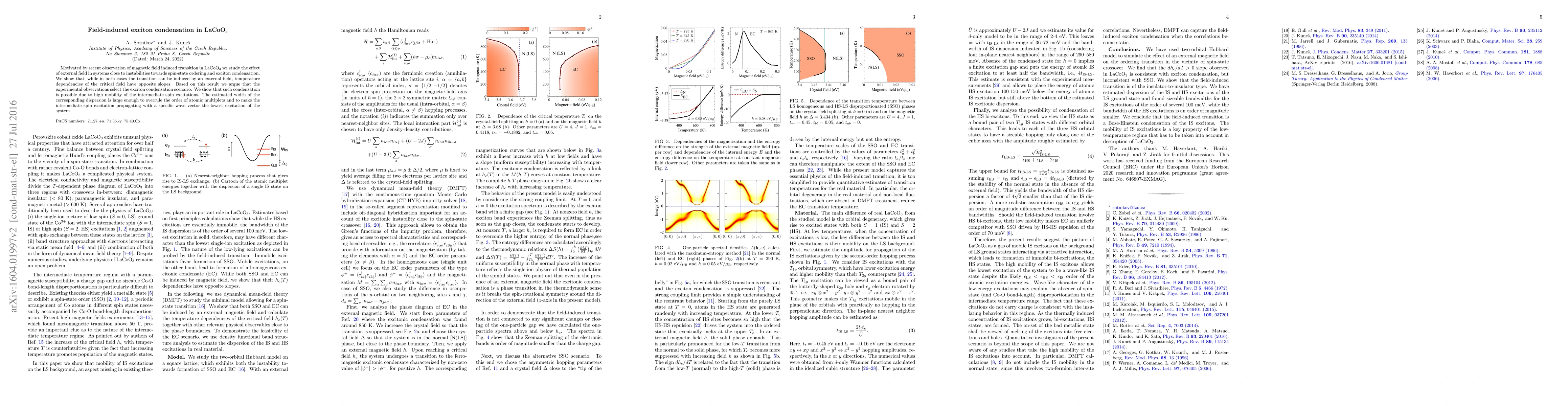 Motivated by recent observation of magnetic field induced transition in LaCoO3 we study the effect of external field in systems close to instabilities towards spin-state ordering and exciton condensation. We show that, while in both cases the transition can be induced by an external field, temperature dependencies of the critical field have opposite slopes. Based on this result we argue that the experimental observations select the exciton condensation scenario. We show that such condensation is possible due to high mobility of the intermediate spin excitations. The estimated width of the corresponding dispersion is large enough to overrule the order of atomic multiplets and to make the intermediate spin excitation propagating with a specific wave vector the lowest excitation of the system.