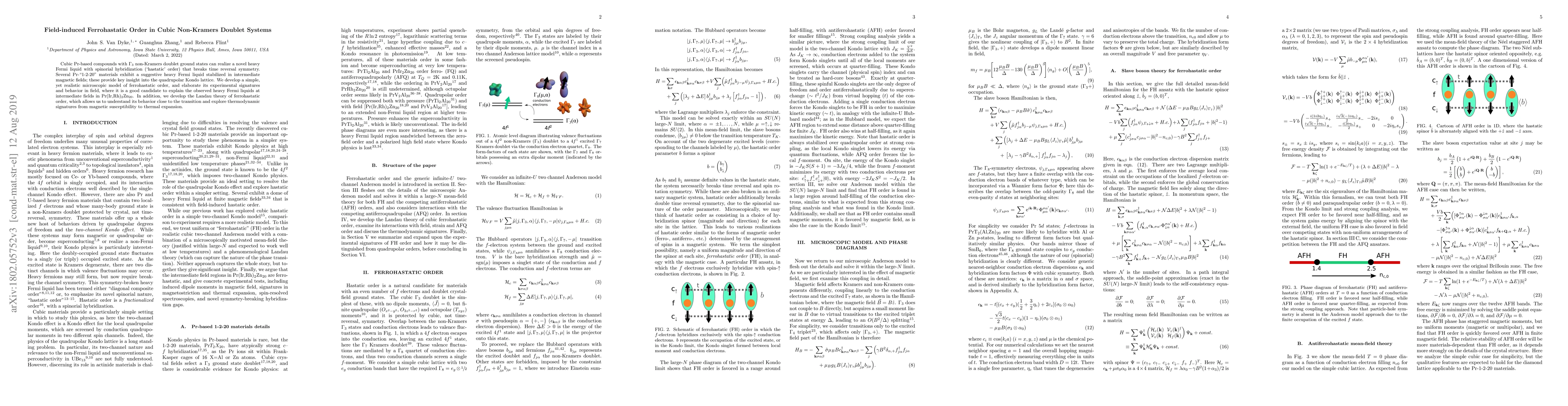 Cubic Pr-based compounds with $\Gamma_3$ non-Kramers doublet ground states can realize a novel heavy Fermi liquid with spinorial hybridization ('hastatic' order) that breaks time reversal symmetry. Several Pr-"1-2-20" materials exhibit a suggestive heavy Fermi liquid stabilized in intermediate magnetic fields; these provide key insight into the quadrupolar Kondo lattice. We develop a simple, yet realistic microscopic model of ferrohastatic order, and elaborate its experimental signatures and behavior in field, where it is a good candidate to explain the observed heavy Fermi liquids at intermediate fields in Pr(Ir,Rh)$_2$Zn$_{20}$. In addition, we develop the Landau theory of ferrohastatic order, which allows us to understand its behavior close to the transition and explore thermodynamic signatures from magnetic susceptibility to thermal expansion.