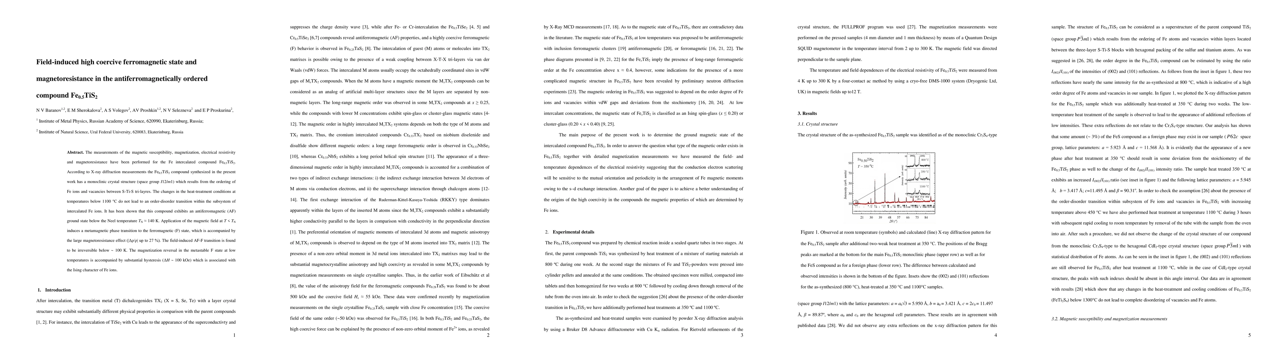 Researchers discovered a unique antiferromagnetic compound Fe0.5TiS2 that exhibits a field-induced high coercive ferromagnetic state with large magnetoresistance effects. The material undergoes an irreversible transition to ferromagnetism below 100 K, accompanied by substantial hysteresis and significant changes in electrical resistance.