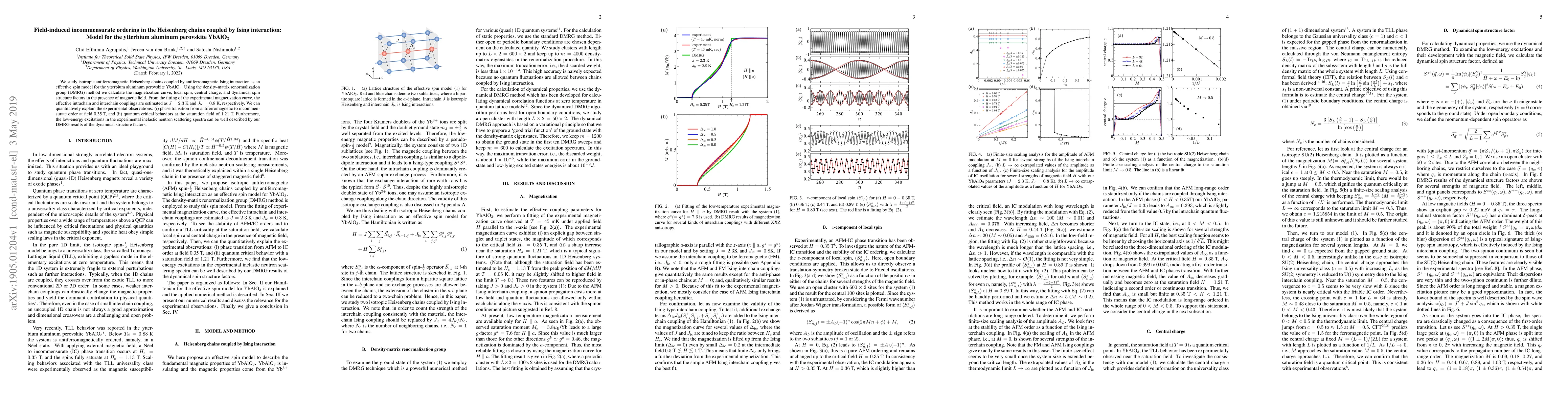 This paper investigates an effective spin model for YbAlO$_3$ using Heisenberg chains coupled by Ising interactions, revealing a phase transition to incommensurate ordering under magnetic fields. The density-matrix renormalization group method explains experimental observations, including the transition at 0.35T and quantum critical behavior at 1.21T.
