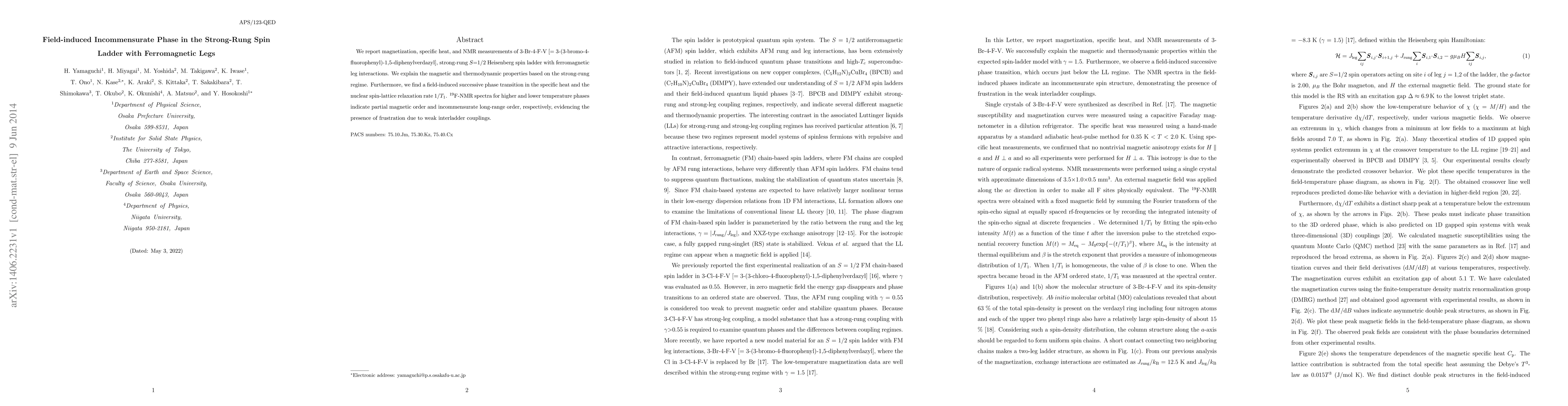 The paper presents a study on 3-Br-4-F-V, a strong-rung S=1/2 Heisenberg spin ladder with ferromagnetic leg interactions. Key findings include a field-induced successive phase transition evidenced by specific heat and 1/T1 measurements, and 19F-NMR evidence of partial magnetic order and incommensurate long-range order, suggesting frustration due to weak interladder couplings.
