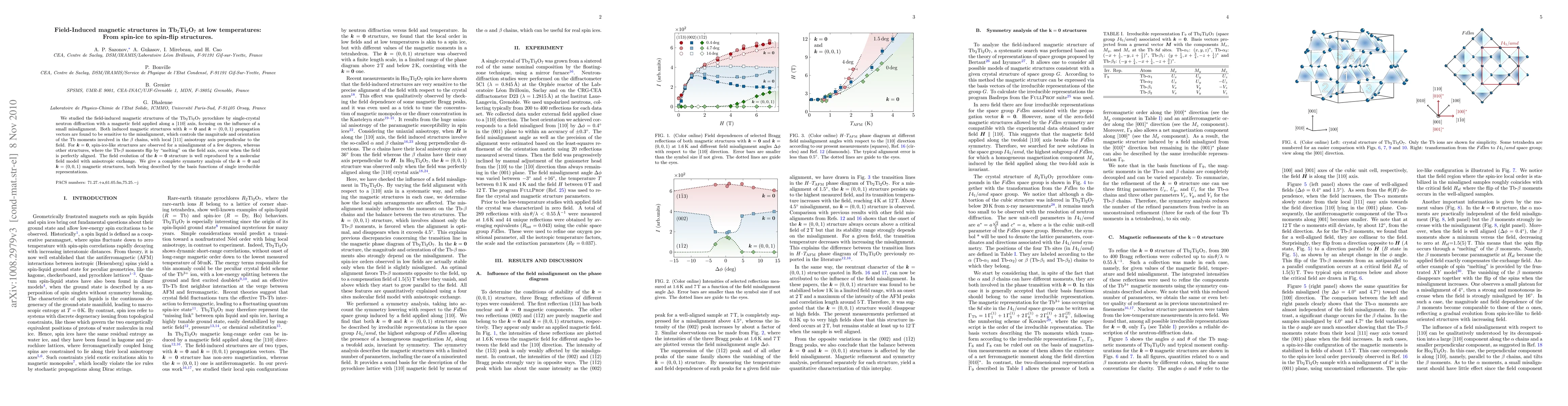 We studied the field-induced magnetic structures of the Tb2Ti2O7 pyrochlore by single-crystal neutron diffraction with a magnetic field applied along a [110] axis, focusing on the influence of a small misalignment. Both induced magnetic structures with k=0 and k=(0,0,1) propagation vectors are found to be sensitive to the misalignment, which controls the magnitude and orientation of the Tb moments involved in the beta chains, with local [111] anisotropy axis perpendicular to the field. For k=0, spin-ice-like structures are observed for a misalignment of a few degrees, whereas other structures, where the Tb-beta moments flip by "melting" on the field axis, occur when the field is perfectly aligned. The field evolution of the k=0 structure is well reproduced by a molecular field model with anisotropic exchange. We give a complete symmetry analysis of the k=0 and k=(0,0,1) magnetic structures, both being described by the basis functions of single irreducible representations.