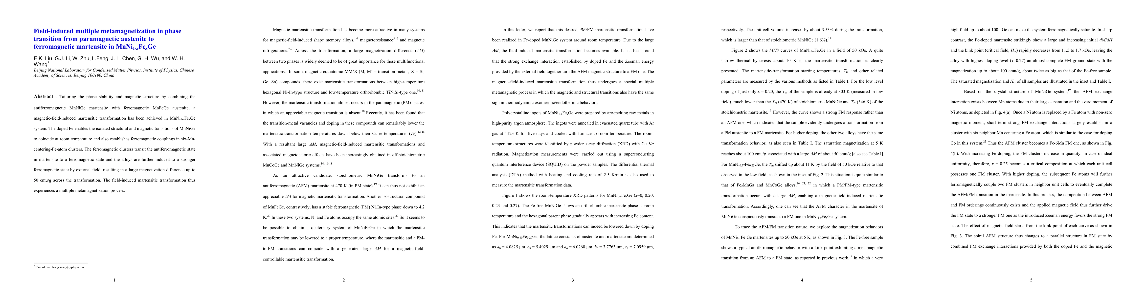 This study explores a magnetic-field-induced martensitic transformation in MnNi1-xFexGe alloys, where Fe doping aligns structural and magnetic transitions at room temperature. The external field induces a multiple metamagnetization process, resulting in a significant magnetization difference of up to 50 emu/g.