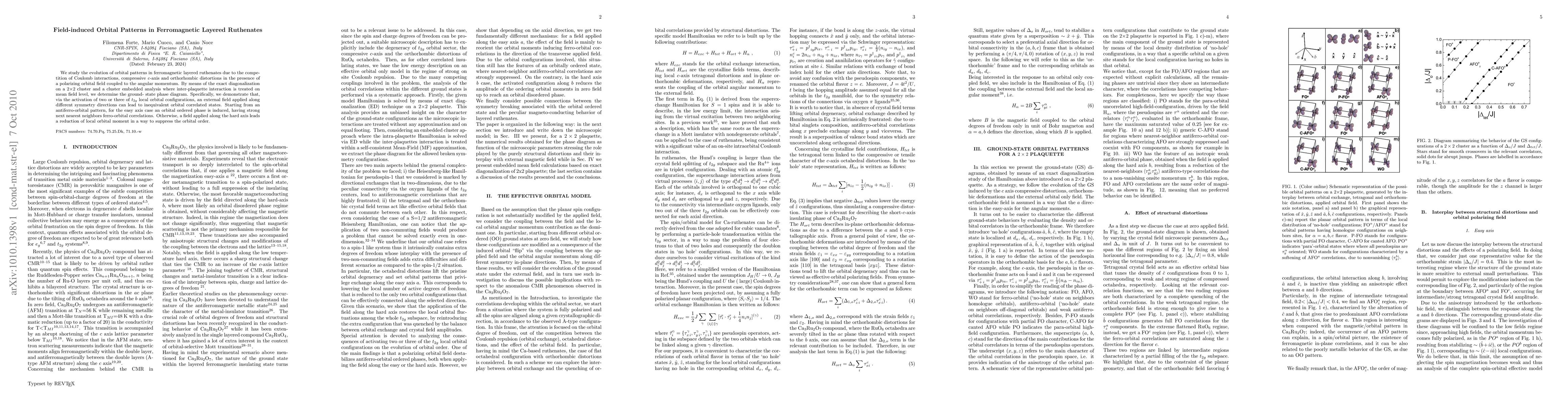 This research investigates the orbital patterns in ferromagnetic layered ruthenates under external polarizing fields, revealing that the application of an external field along different symmetry directions can activate two or three t_2g local orbital configurations, leading to distinct orbital correlated states. The study finds that an easy axis field induces an orbital ordered phase with strong next-nearest neighbor ferro-orbital correlations, while a hard axis field reduces local orbital moments and suppresses orbital order.