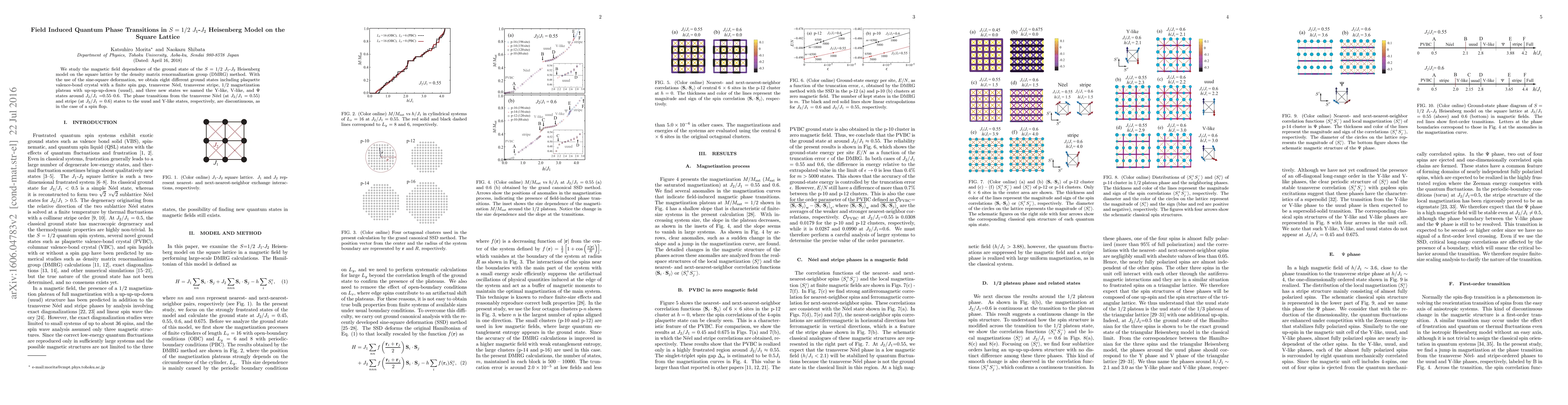 This paper investigates the magnetic field-induced quantum phase transitions in the $S=1/2$ $J_1$-$J_2$ Heisenberg model on the square lattice using the DMRG method. It identifies eight distinct phases, including new Y-like, V-like, and $\Psi$ phases, with some transitions being discontinuous akin to spin-flop transitions.