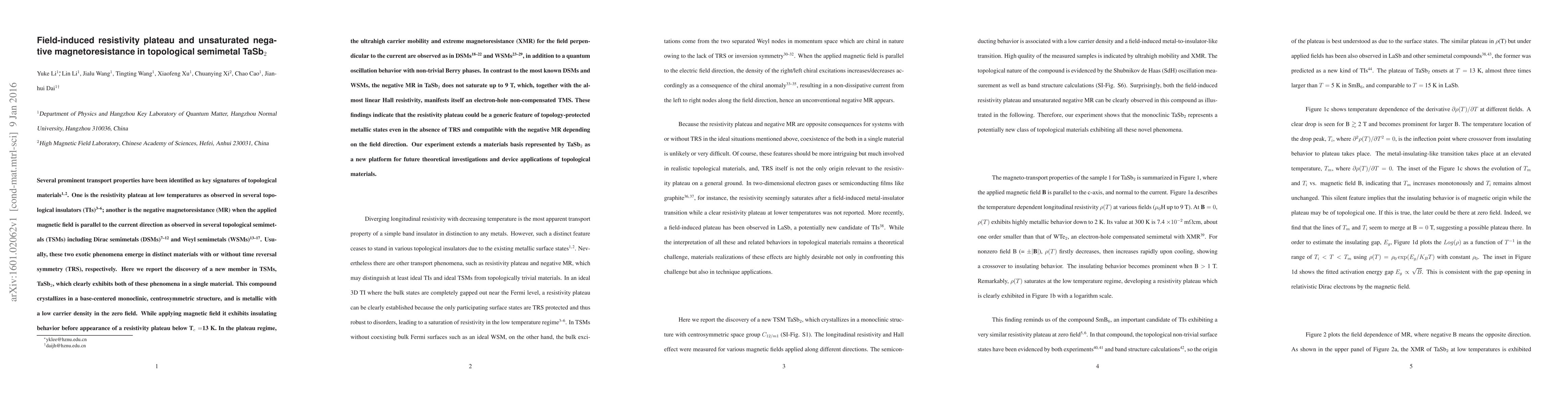 This paper reports the discovery of TaSb2, a topological semimetal exhibiting both a resistivity plateau and unsaturated negative magnetoresistance, phenomena typically found in different topological materials. TaSb2 shows a unique combination of these properties, suggesting a broader applicability of topological protection in metallic states.
