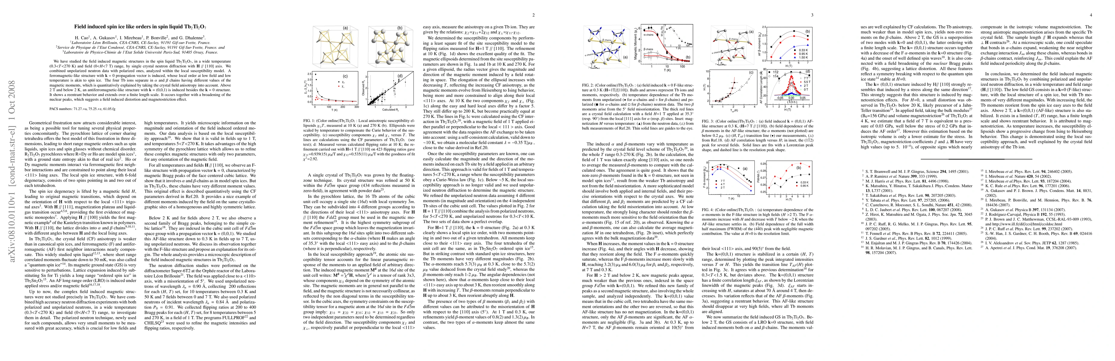 We have studied the field induced magnetic structures in the spin liquid Tb$_2$Ti$_2$O$_7$, in a wide temperature (0.3$<$$T$$<$270 K) and field (0$<$$H$$<$7 T) range, by single crystal neutron diffraction with $\bf{H}$ // [110] axis. We combined unpolarized neutron data with polarized ones, analyzed within the local susceptibility model. A ferromagnetic-like structure with $\bf{k}$ = 0 propagation vector is induced, whose local order at low field and low temperature is akin to spin ice. The four Tb ions separate in $\alpha$ and $\beta$ chains having different values of the magnetic moments, which is quantitatively explained by taking the crystal field anisotropy into account. Above 2 T and below 2 K, an antiferromagnetic-like structure with $\bf{k}$ = (0,0,1) is induced besides the $\bf{k}$ = 0 structure. It shows a reentrant behavior and extends over a finite length scale. It occurs together with a broadening of the nuclear peaks, which suggests a field induced distortion and magnetostriction effect.