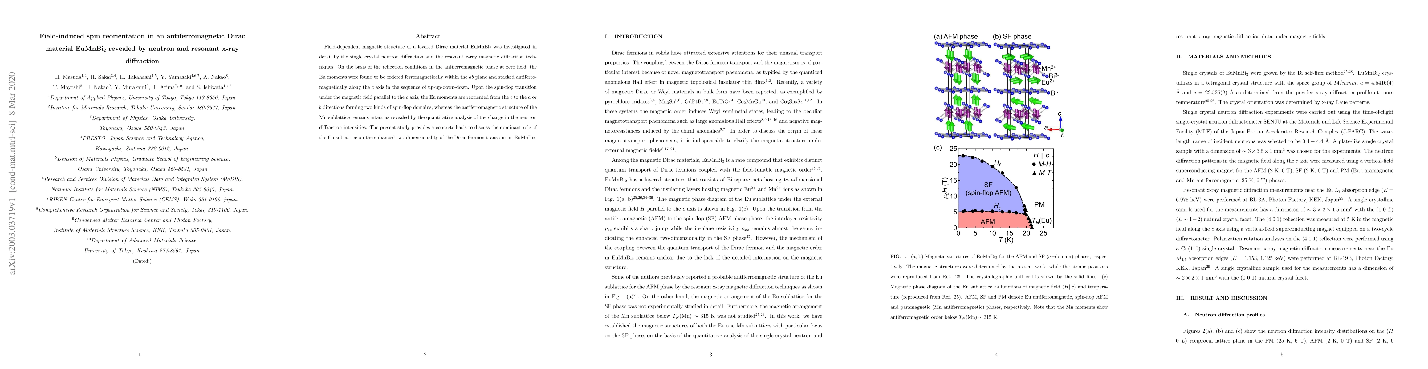 This study investigates the field-induced spin reorientation in EuMnBi$_2$ using neutron and resonant x-ray diffraction, revealing a spin-flop transition where Eu moments reorient from the $c$ to $a$ or $b$ directions while the Mn sublattice remains unchanged, highlighting the Eu sublattice's role in Dirac fermion transport.