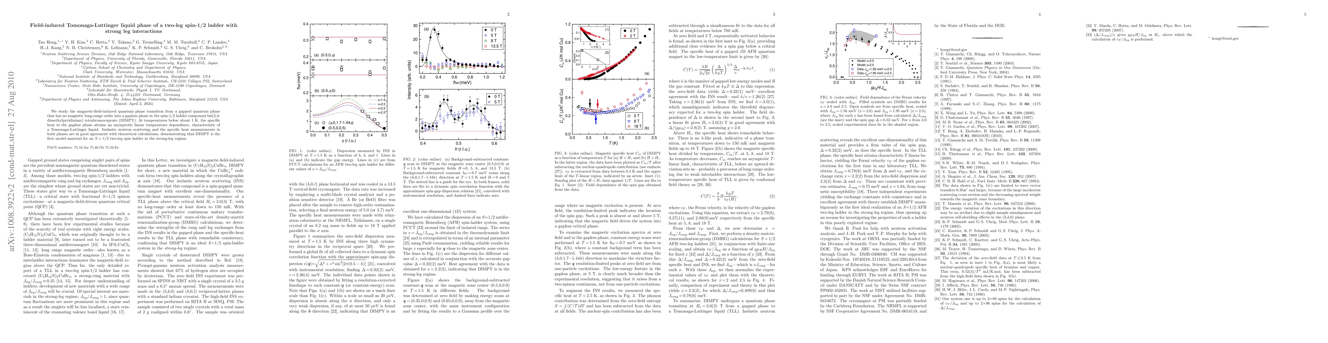 This paper investigates the magnetic-field-induced quantum phase transition in a spin-1/2 ladder compound, DIMPY, showing a transition from a gapped phase to a Tomonaga-Luttinger liquid phase characterized by linear temperature dependence of specific heat. Theoretical calculations align with experimental data, confirming DIMPY as a model material for strong-leg interactions in spin ladders.