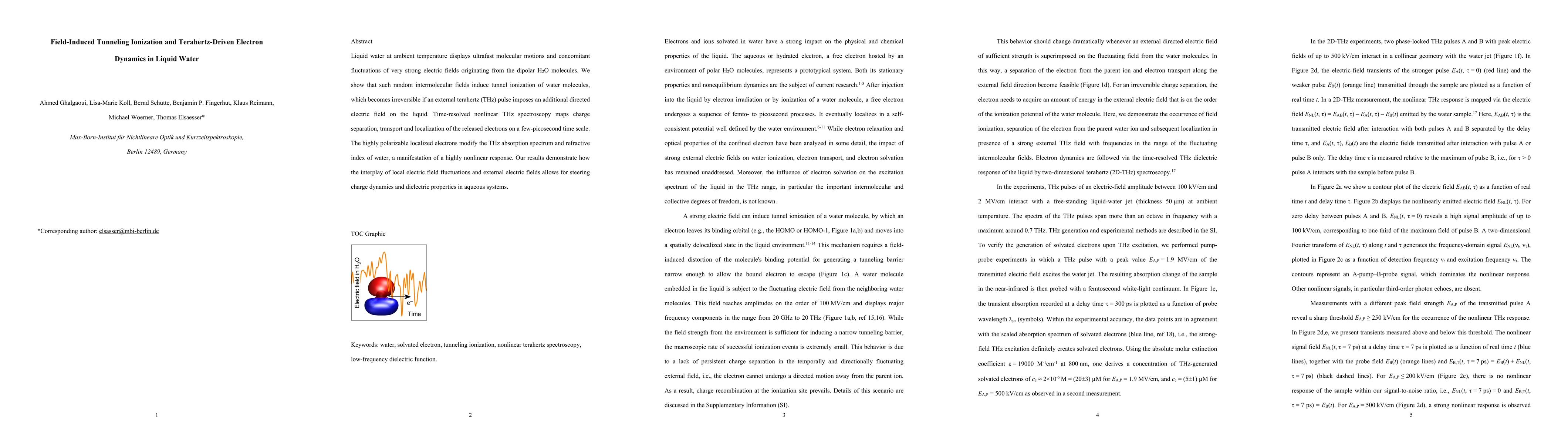 This study reveals that random intermolecular fields in liquid water induce tunnel ionization, which becomes irreversible under the influence of an external terahertz pulse. Time-resolved spectroscopy shows the dynamics of charge separation and electron localization, demonstrating the nonlinear response of water's dielectric properties to combined electric field effects.