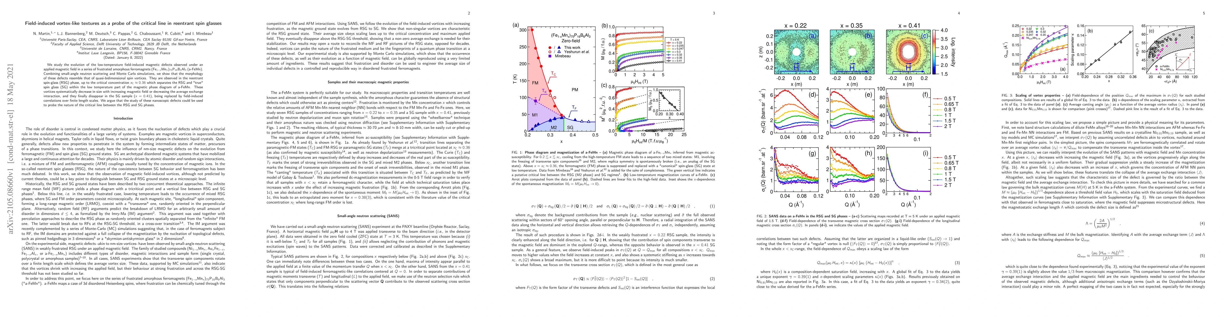 We study the evolution of the low-temperature field-induced magnetic defects observed under an applied magnetic field in a series of frustrated amorphous ferromagnets (Fe$_{1-x}$Mn$_{x}$)$_{75}$P$_{16}$B$_{3}$Al$_{3}$ (a-FeMn). Combining small-angle neutron scattering and Monte Carlo simulations, we show that the morphology of these defects resemble that of quasi-bidimensional spin vortices. They are observed in the reentrant spin-glass (RSG) phase, up to the critical concentration $x_{\rm C} \approx 0.36$ which separates the RSG and "true" spin glass (SG) within the low temperature part of the magnetic phase diagram of a-FeMn. These vortices systematically decrease in size with increasing magnetic field or decreasing the average exchange interaction, and they finally disappear in the SG sample ($x = 0.41$), being replaced by field-induced correlations over finite length scales. We argue that the study of these nanoscopic defects could be used to probe the nature of the critical line between the RSG and SG phases.