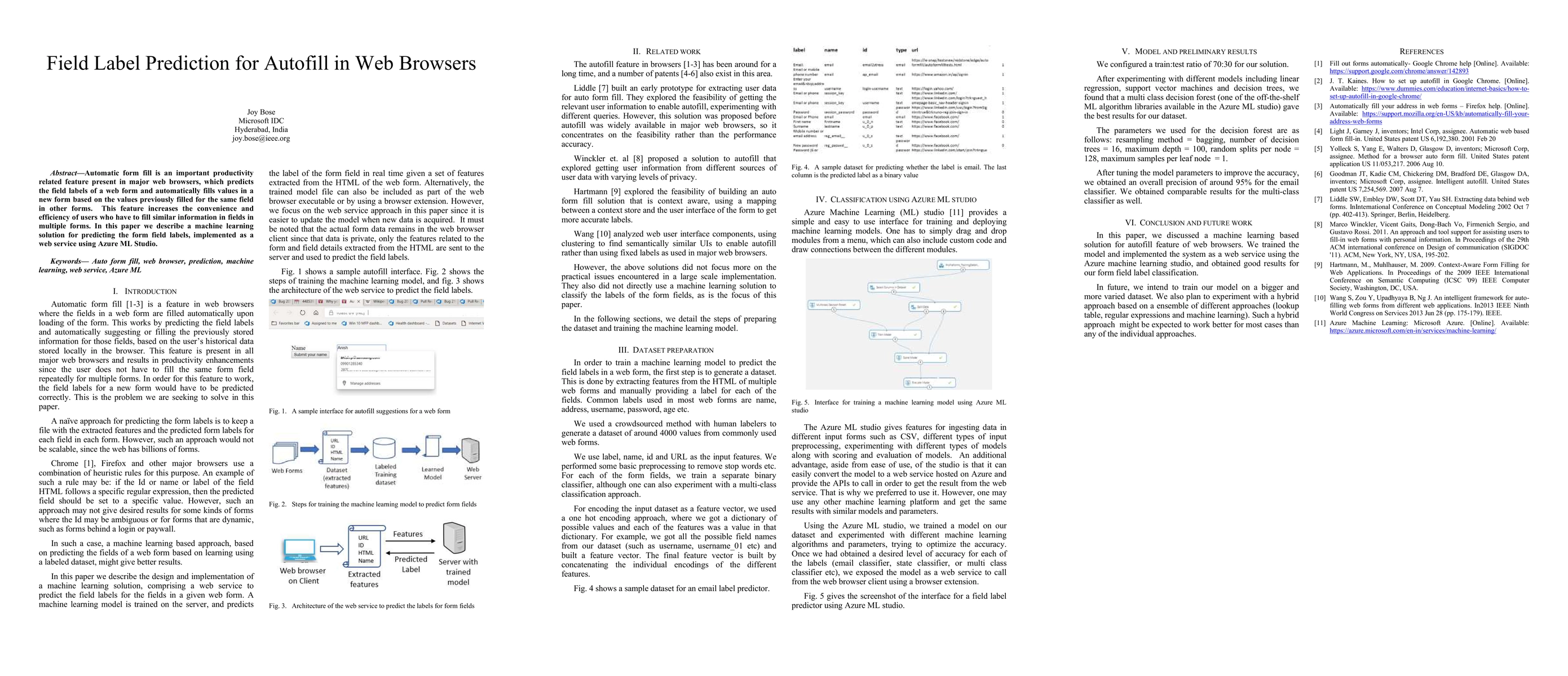 This paper presents a machine learning solution for predicting web form field labels to enhance autofill functionality in web browsers, implemented as a web service via Azure ML Studio to improve user convenience and efficiency.