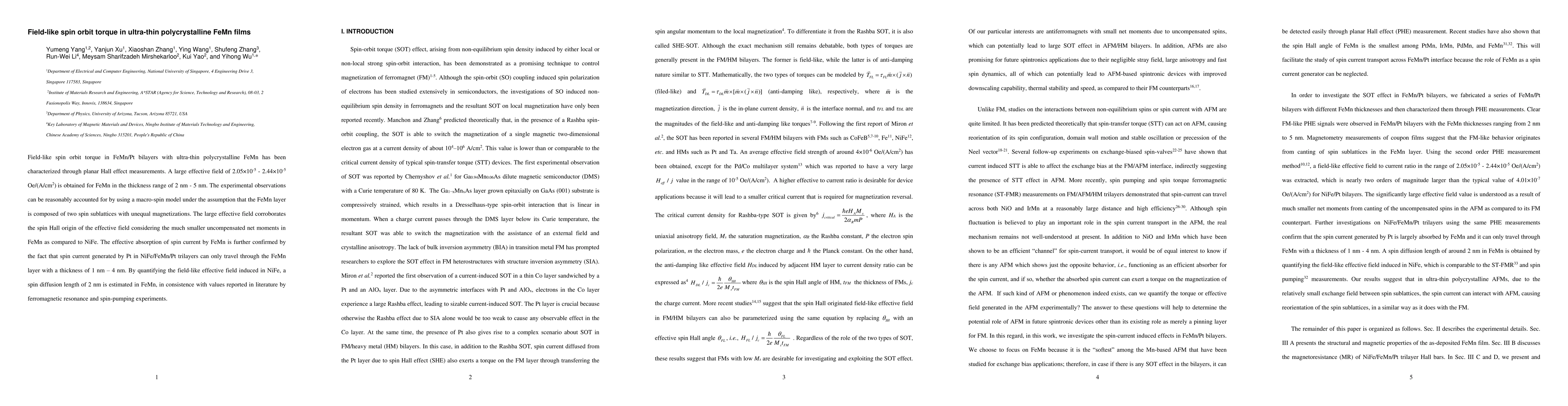 This paper investigates the field-like spin orbit torque in ultra-thin polycrystalline FeMn films, revealing a large effective field in the 2 to 5 nm thickness range, confirmed through planar Hall effect measurements and a macro-spin model. The study estimates a spin diffusion length of 2 nm in FeMn, consistent with previous reports.