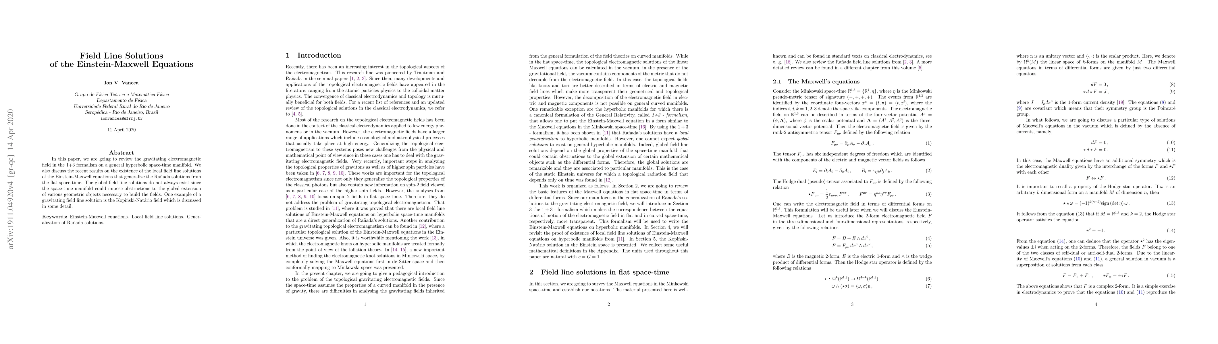 In this paper, we are going to review the gravitating electromagnetic field in the 1+3 formalism on a general hyperbolic space-time manifold. We also discuss the recent results on the existence of the local field line solutions of the Einstein-Maxwell equations that generalize the Ra\~{n}ada solutions from the flat space-time. The global field line solutions do not always exist since the space-time manifold could impose obstructions to the global extension of various geometric objects necessary to build the fields. One example of a gravitating field line solution is the Kopi\'{n}ski-Nat\'{a}rio field which is discussed in some detail.