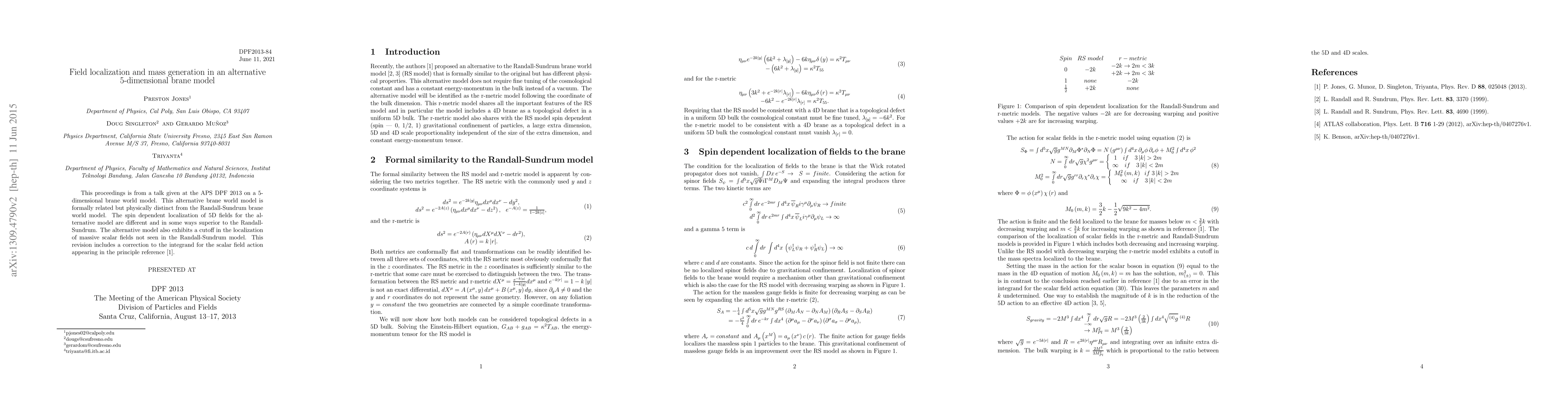 This proceedings is based on a talk given at the APS DPF 2013 on an alternative 5-dimensional brane world model which is related to but has some physically distinct features from the Randall-Sundrum brane world model. The spin dependent localization of 5D fields for the alternative model are different and in some ways superior to the original Randall- Sundrum Model. The alternative model also exhibits a cutoff in the lo-calization of massive scalar fields not seen in the Randall-Sundrum and includes a self consistent mass prediction of two possible scalar bosons. Setting the warping factor in the new model consistent with a 126 GeV localized scalar boson predicts the existence of a second scalar boson at 177 GeV. This second scalar boson could be localized or non localized depending on the type of warping factor.