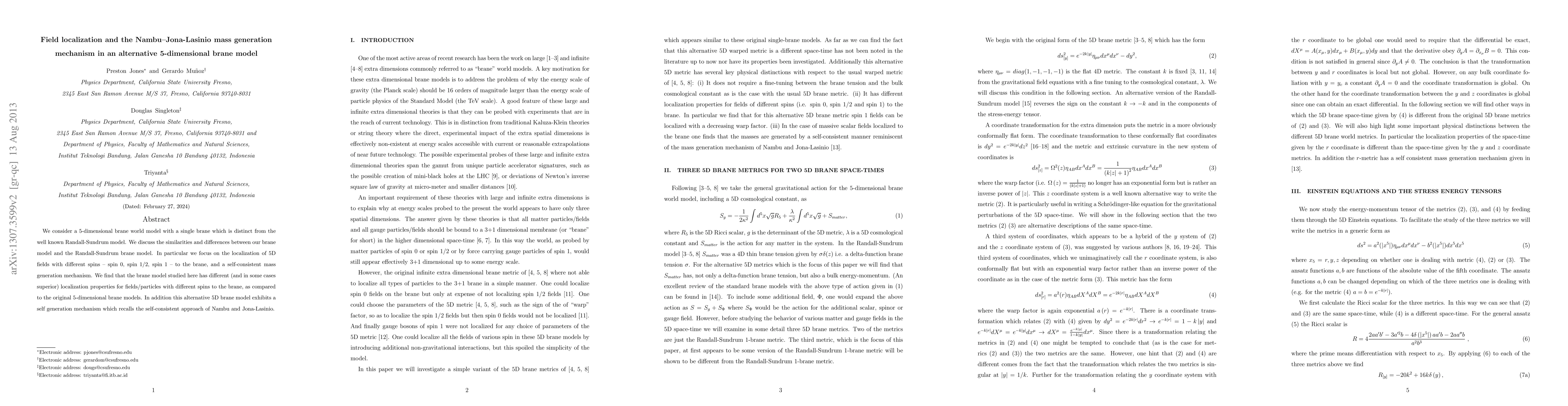 We consider a 5-dimensional brane world model with a single brane which is distinct from the well known Randall-Sundrum model. We discuss the similarities and differences between our brane model and the Randall-Sundrum brane model. In particular we focus on the localization of 5D fields with different spins -- spin 0, spin 1/2, spin 1 -- to the brane, and a self-consistent mass generation mechanism. We find that the brane model studied here has different (and in some cases superior) localization properties for fields/particles with different spins to the brane, as compared to the original 5-dimensional brane models. In addition this alternative 5D brane model exhibits a self generation mechanism which recalls the self-consistent approach of Nambu and Jona-Lasinio.