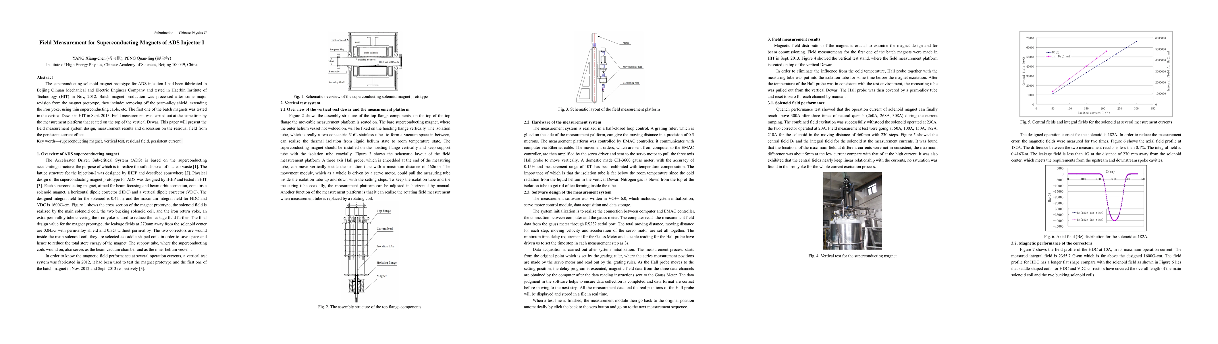 The superconducting solenoid magnet prototype for ADS injection-I had been fabricated in Beijing Qihuan Mechanical and Electric Engineer Company and tested in Haerbin Institute of Technology (HIT) in Nov, 2012. Batch magnet production was processed after some major revision from the magnet prototype, they include: removing off the perm-alloy shield, extending the iron yoke, using thin superconducting cable, etc. The first one of the batch magnets was tested in the vertical Dewar in HIT in Sept. 2013. Field measurement was carried out at the same time by the measurement platform that seated on the top of the vertical Dewar. This paper will present the field measurement system design, measurement results and discussion on the residual field from the persistent current effect.