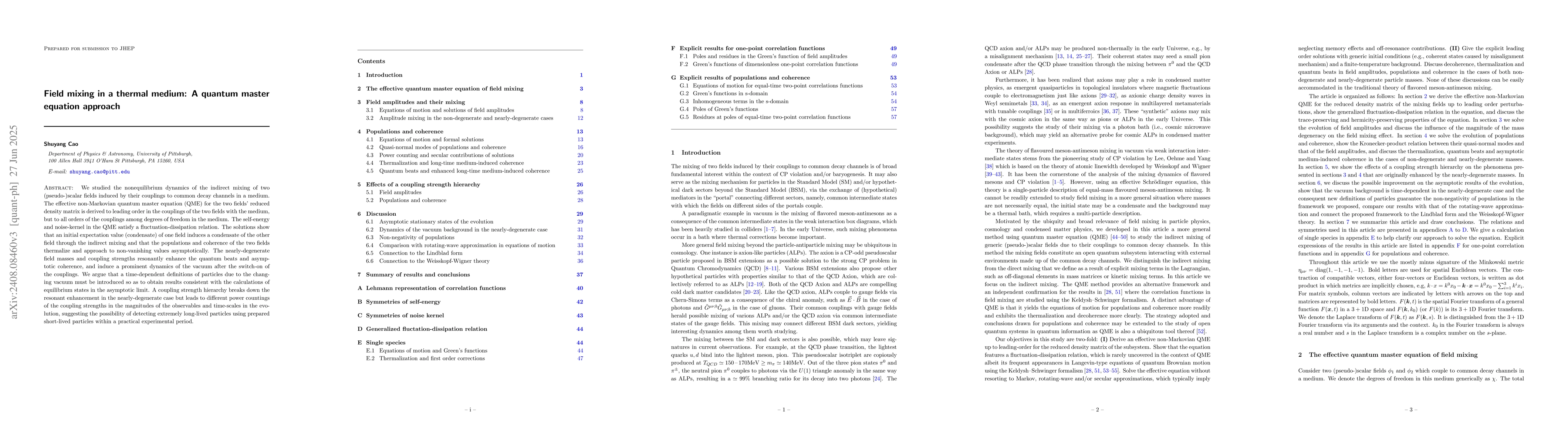 We studied the nonequilibrium dynamics of the indirect mixing of two (pseudo-)scalar fields induced by their couplings to common decay channels in a medium. The effective non-Markovian quantum master equation (QME) for the two fields' reduced density matrix is derived to leading order in the couplings of the two fields with the medium, but to all orders of the couplings among degrees of freedom in the medium. The self-energy and noise-kernel in the QME satisfy a fluctuation-dissipation relation. The solutions show that an initial expectation value (condensate) of one field induces a condensate of the other field through the indirect mixing and that the populations and coherence of the two fields thermalize and approach to non-vanishing values asymptotically. The nearly-degenerate field masses and coupling strengths resonantly enhance the quantum beats and asymptotic coherence, and induce a prominent dynamics of the vacuum after the switch-on of the couplings. We argue that a time-dependent definitions of particles due to the changing vacuum must be introduced so as to obtain results consistent with the calculations of equilibrium states in the asymptotic limit. A coupling strength hierarchy breaks down the resonant enhancement in the nearly-degenerate case but leads to different power countings of the coupling strengths in the magnitudes of the observables and time-scales in the evolution, suggesting the possibility of detecting extremely long-lived particles using prepared short-lived particles within a practical experimental period.
