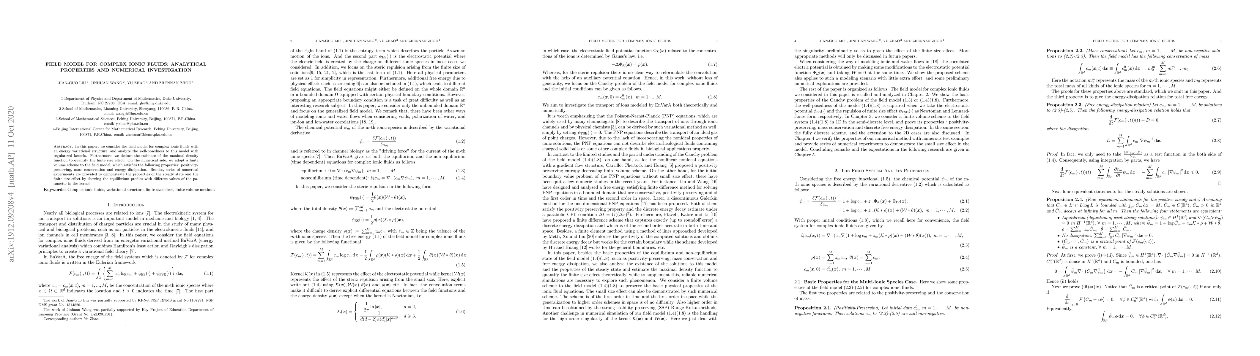 In this paper, we consider the field model for complex ionic fluids with an energy variational structure, and analyze the well-posedness to this model with regularized kernels. Furthermore, we deduce the estimate of the maximal density function to quantify the finite size effect. On the numerical side, we adopt a finite volume scheme to the field model, which satisfies the following properties: positivity-preserving, mass conservation and energy dissipation. Besides, series of numerical experiments are provided to demonstrate the properties of the steady state and the finite size effect by showing the equilibrium profiles with different values of the parameter in the kernel.