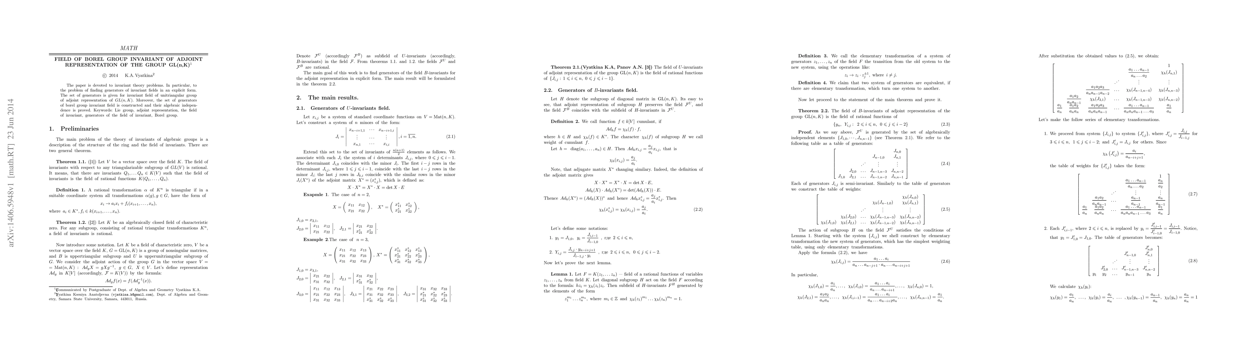 This paper investigates invariant theory, specifically finding explicit generators for the invariant field of the unitriangular group in the adjoint representation of $GL(n, K)$. It also constructs and proves the algebraic independence of generators for the Borel group invariant field.