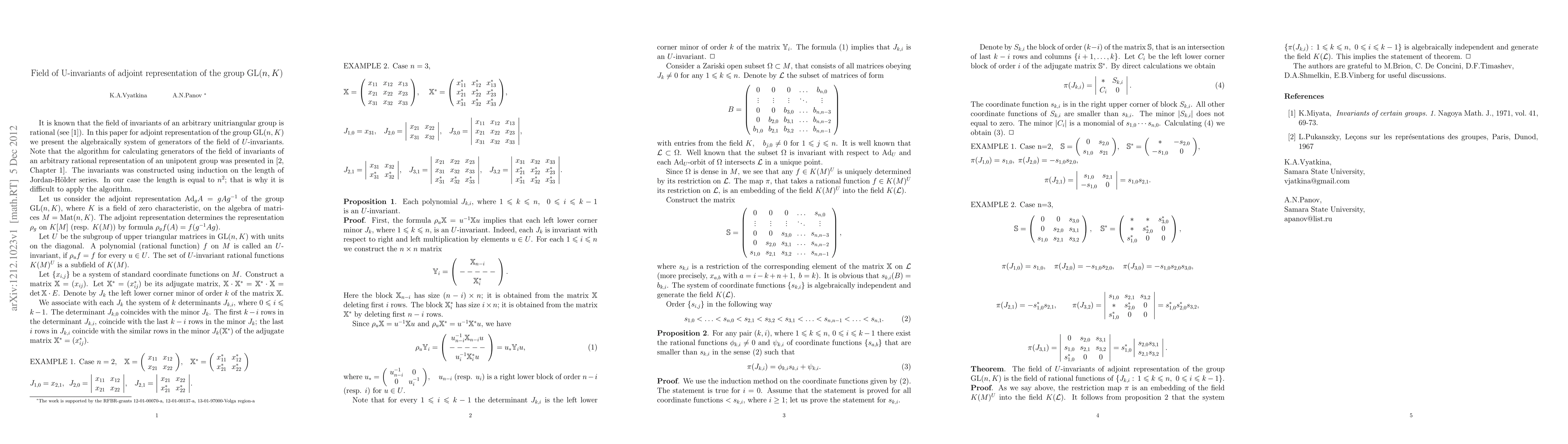 We obtain system of generators of the field of U-invariants of ajoint representation of the group GL(n,K).