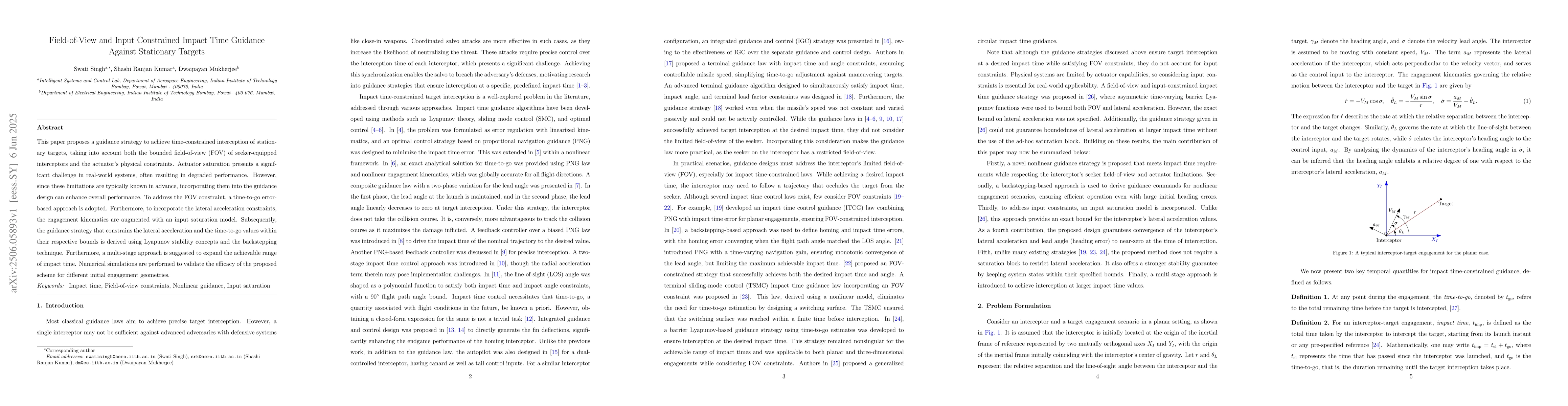 This paper proposes a guidance strategy to intercept stationary targets within time constraints, accounting for the seeker's field-of-view and physical actuator limitations. It uses Lyapunov stability concepts to derive a control scheme that enhances overall performance.
