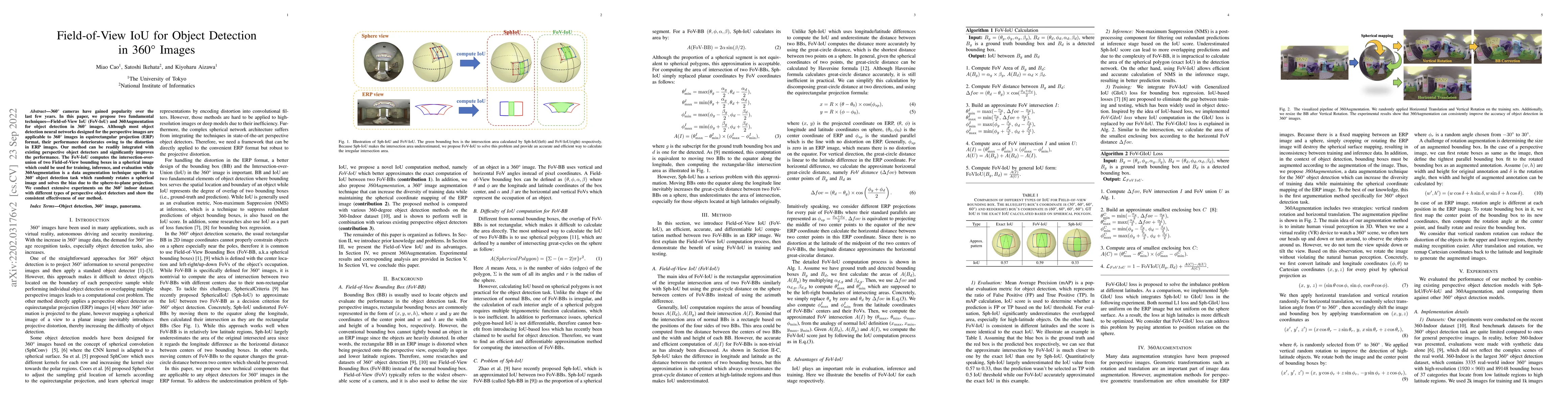 This paper proposes Field-of-View IoU (FoV-IoU) and 360Augmentation techniques to enhance object detection in 360° images, addressing performance deterioration due to equirectangular projection distortions. The FoV-IoU metric and 360Augmentation method improve existing perspective detectors and are validated on the 360indoor dataset.