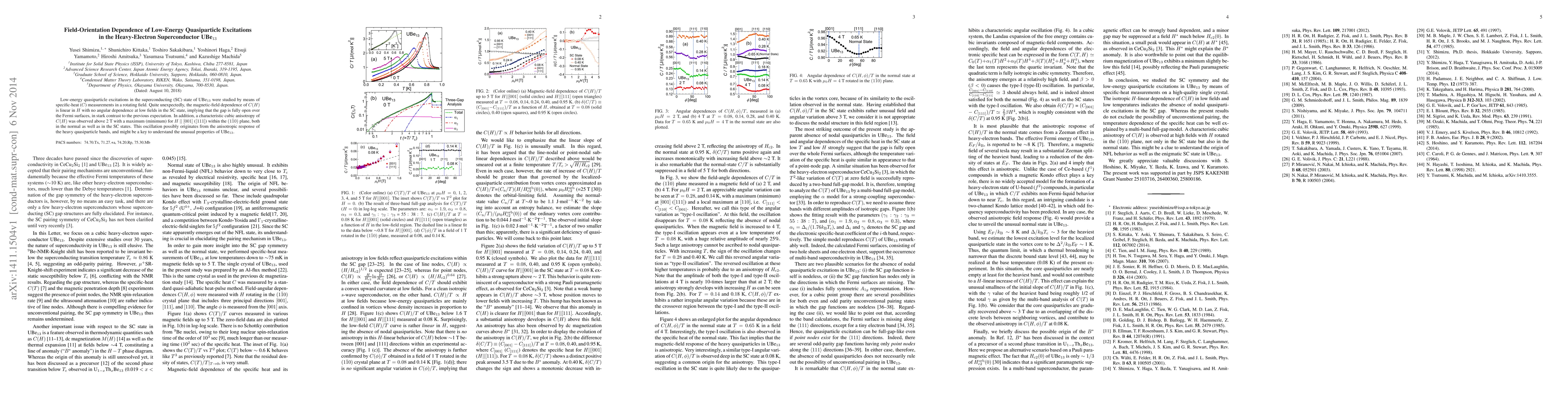 Low-energy quasiparticle excitations in the superconducting (SC) state of UBe$_{13}$ were studied by means of specific-heat ($C$) measurements in a rotating field. Quite unexpectedly, the magnetic-field dependence of $C(H)$ is linear in $H$ with no angular dependence at low fields in the SC state, implying that the gap is fully open over the Fermi surfaces, in stark contrast to the previous expectation. In addition, a characteristic cubic anisotropy of $C(H)$ was observed above 2~T with a maximum (minimum) for $H$ $||$ $[001]$ ($[111]$) within the $(1\bar{1}0)$ plane, both in the normal as well as in the SC states. This oscillation possibly originates from the anisotropic response of the heavy quasiparticle bands, and might be a key to understand the unusual properties of UBe$_{13}$.