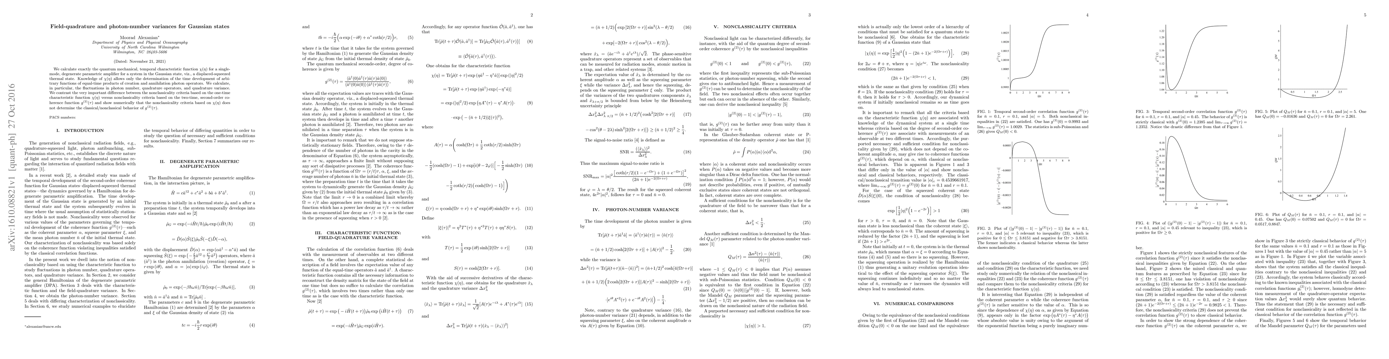 This paper precisely computes the quantum mechanical characteristic function for Gaussian states in a single-mode degenerate parametric amplifier, focusing on photon-number variances and quadrature fluctuations. It highlights the distinction between nonclassicality criteria derived from the one-time characteristic function and those from the two-time second-order coherence function, demonstrating that the former does not predict the classical/nonclassical behavior of the latter.