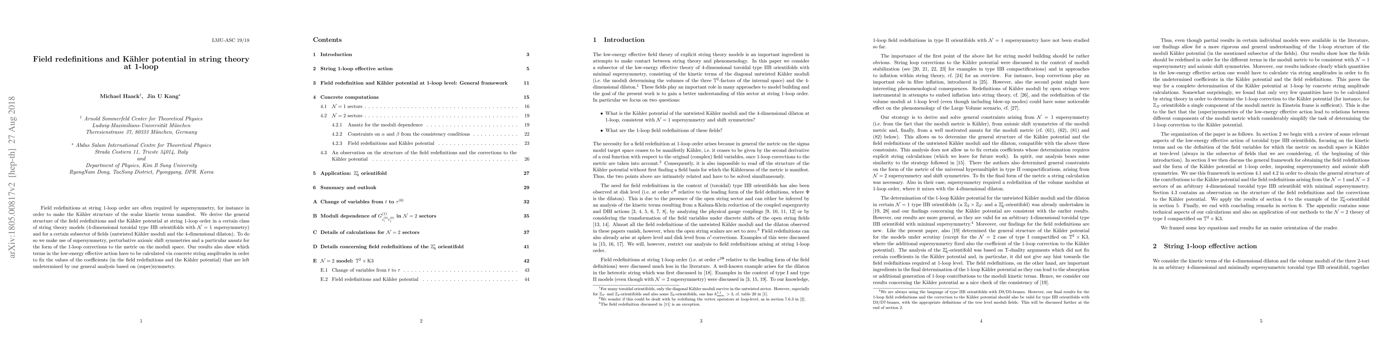 Field redefinitions at string 1-loop order are often required by supersymmetry, for instance in order to make the K\"ahler structure of the scalar kinetic terms manifest. We derive the general structure of the field redefinitions and the K\"ahler potential at string 1-loop order in a certain class of string theory models (4-dimensional toroidal type IIB orientifolds with ${\cal N}=1$ supersymmetry) and for a certain subsector of fields (untwisted K\"ahler moduli and the 4-dimensional dilaton). To do so we make use of supersymmetry, perturbative axionic shift symmetries and a particular ansatz for the form of the 1-loop corrections to the metric on the moduli space. Our results also show which terms in the low-energy effective action have to be calculated via concrete string amplitudes in order to fix the values of the coefficients (in the field redefinitions and the K\"ahler potential) that are left undetermined by our general analysis based on (super)symmetry.