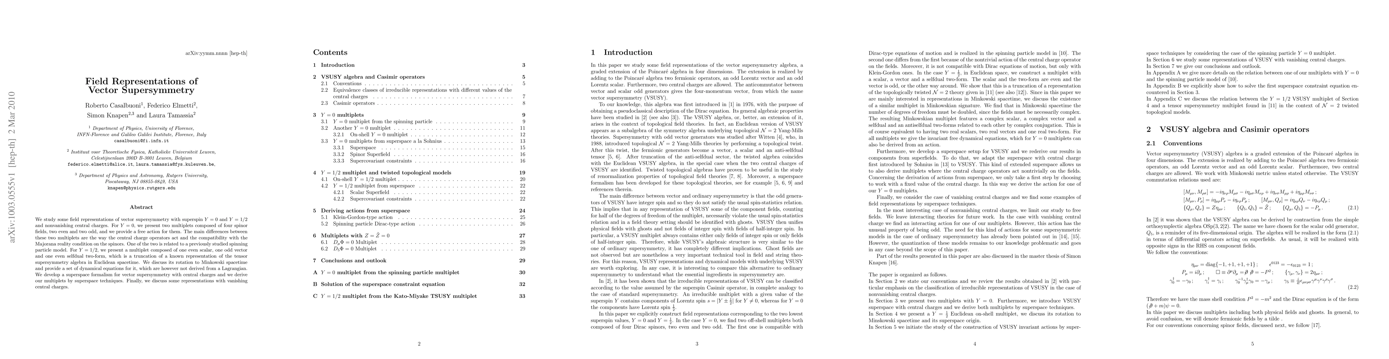 We study some field representations of vector supersymmetry with superspin Y=0 and Y=1/2 and nonvanishing central charges. For Y=0, we present two multiplets composed of four spinor fields, two even and two odd, and we provide a free action for them. The main differences between these two multiplets are the way the central charge operators act and the compatibility with the Majorana reality condition on the spinors. One of the two is related to a previously studied spinning particle model. For Y=1/2, we present a multiplet composed of one even scalar, one odd vector and one even selfdual two-form, which is a truncation of a known representation of the tensor supersymmetry algebra in Euclidean spacetime. We discuss its rotation to Minkowski spacetime and provide a set of dynamical equations for it, which are however not derived from a Lagrangian. We develop a superspace formalism for vector supersymmetry with central charges and we derive our multiplets by superspace techniques. Finally, we discuss some representations with vanishing central charges.