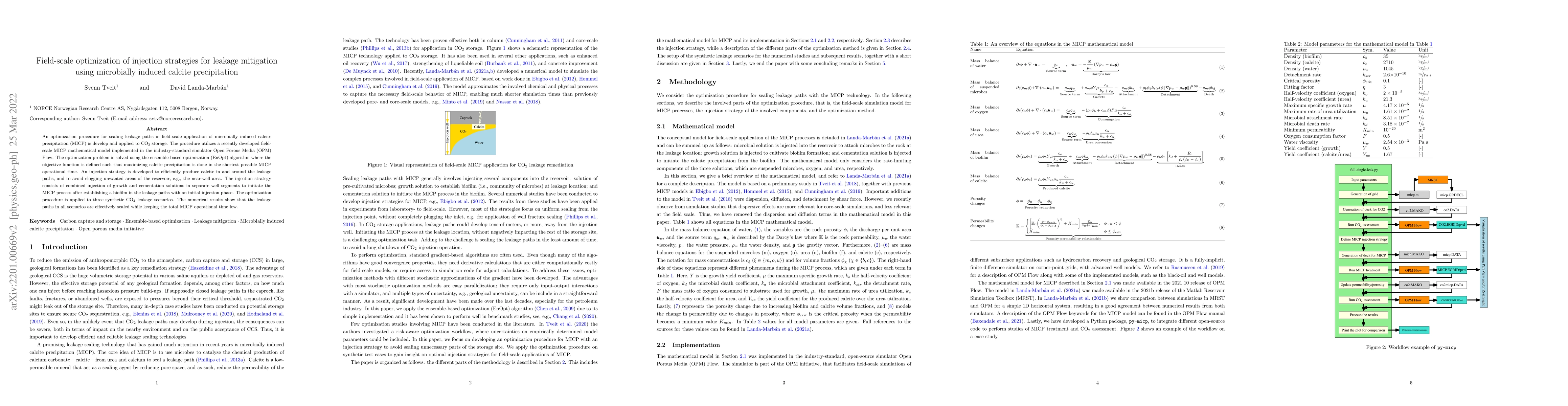 An optimization procedure for sealing leakage paths in field-scale application of microbially induced calcite precipitation (MICP) is develop and applied to CO$_2$ storage. The procedure utilizes a recently developed field-scale MICP mathematical model implemented in the industry-standard simulator Open Porous Media (OPM) Flow. The optimization problem is solved using the ensemble-based optimization (EnOpt) algorithm where the objective function is defined such that maximizing calcite precipitation is done in the shortest possible MICP operational time. An injection strategy is developed to efficiently produce calcite in and around the leakage paths, and to avoid clogging unwanted areas of the reservoir, e.g., the near-well area. The injection strategy consists of combined injection of growth and cementation solutions in separate well segments to initiate the MICP process after establishing a biofilm in the leakage paths with an initial injection phase. The optimization procedure is applied to three synthetic CO$_2$ leakage scenarios. The numerical results show that the leakage paths in all scenarios are effectively sealed while keeping the total MICP operational time low.