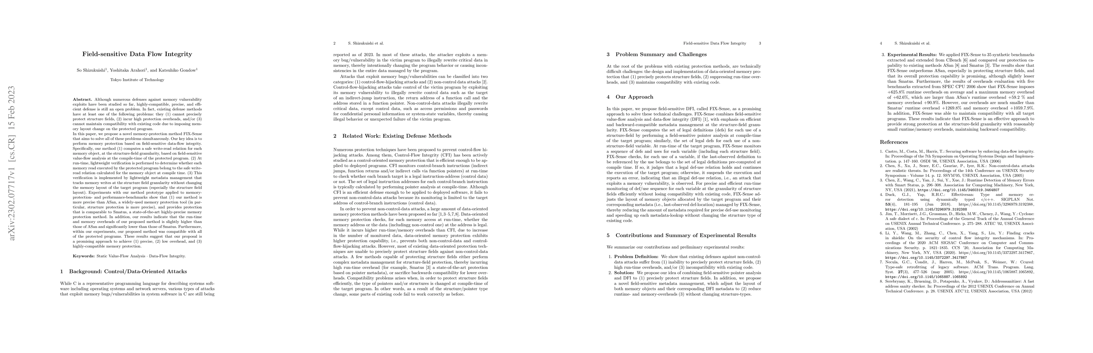This paper proposes FIX-Sense, a novel memory-protection method that addresses the limitations of existing defenses by ensuring precise protection of structure fields, minimizing overhead, and maintaining compatibility with existing code. The method uses field-sensitive data-flow integrity to verify memory reads against precomputed safe write-read relations at compile-time, with lightweight metadata management at run-time.