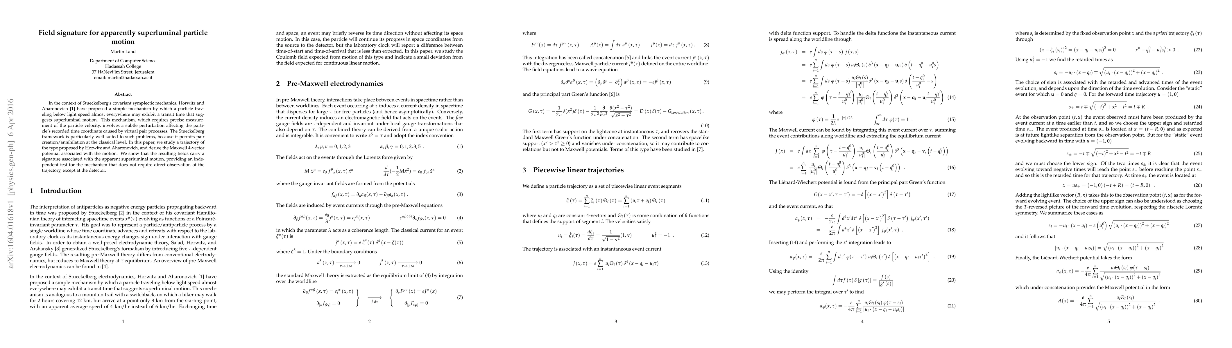 In the context of Stueckelberg's covariant symplectic mechanics, Horwitz and Aharonovich have proposed a simple mechanism by which a particle traveling below light speed almost everywhere may exhibit a transit time that suggests superluminal motion. This mechanism, which requires precise measurement of the particle velocity, involves a subtle perturbation affecting the particle's recorded time coordinate caused by virtual pair processes. The Stueckelberg framework is particularly well suited to such problems, because it permits pair creation/annihilation at the classical level. In this paper, we study a trajectory of the type proposed by Horwitz and Aharonovich, and derive the Maxwell 4-vector potential associated with the motion. We show that the resulting fields carry a signature associated with the apparent superluminal motion, providing an independent test for the mechanism that does not require direct observation of the trajectory, except at the detector.