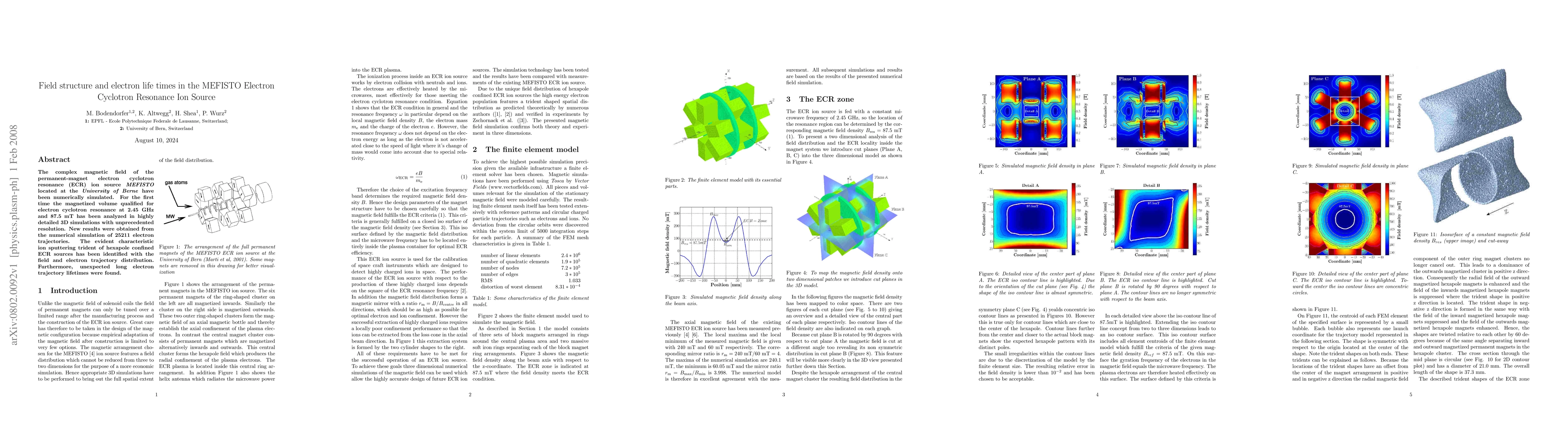 This research paper presents detailed 3D simulations of the magnetic field in the MEFISTO ECR ion source, revealing unprecedented insights into the electron cyclotron resonance at 2.45 GHz and 87.5 mT. The study identified the characteristic ion sputtering trident and discovered unexpectedly long electron trajectory lifetimes.
